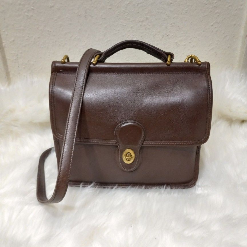 Coach Willis Bag 9927 Leather Brown Brass Hardware Vintage 1990s with Strap This wonderful vintage 1996 Coach Willis is in pre-owned condition with light marks and scuffs on the outside, but it just adds to the vintage vibe! Super soft leather. Coach Classic Willis in brown, Style 9927,made in the 1990s (USA) Measures about 9 1/2" high x 3 1/2" deep x 10 1/2" wide. Strap drop is about 24" at longest, and is adjustable. Features: Full-width slip pocket on exterior back Turn-lock flap closure Flap opens to another full-width slip pocket Zip pocket inside Removable long strap Short "briefcase type" handle