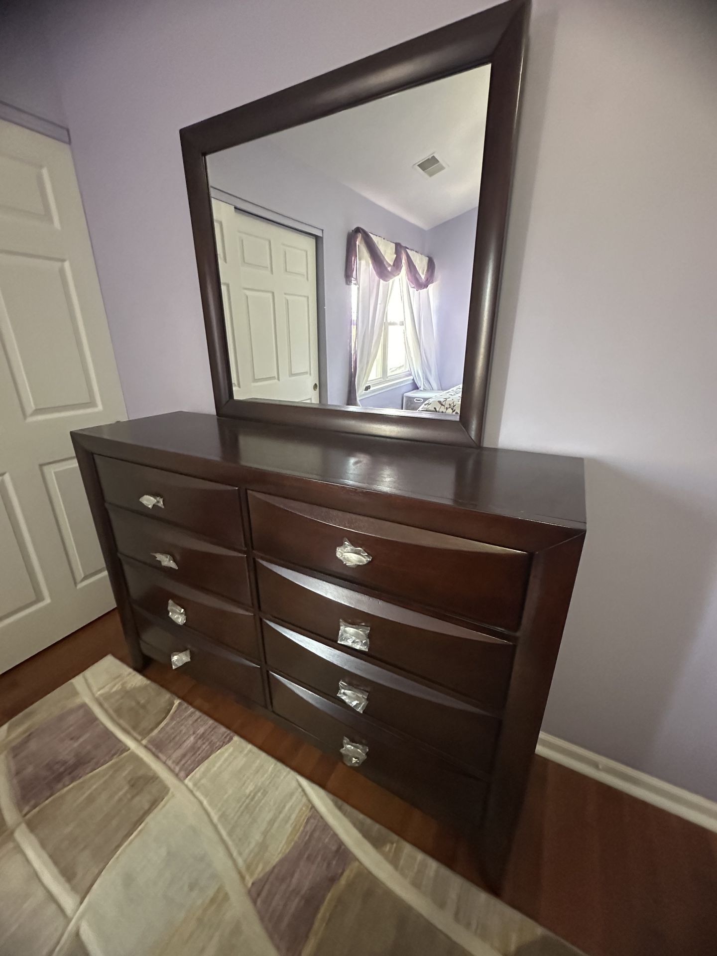 Beautiful dresser with matching mirror in excellent condition. Features a rich dark wood finish with a modern, elegant design and smooth drawer operation. Includes multiple spacious drawers for plenty of storage, perfect for organizing clothes and essentials. Mirror is large and sturdy, great for everyday use. Very well maintained with no scratches or damage. Perfect addition to any bedroom or can be paired with a full matching set. Pickup only. Priced to sell quickly. Open to reasonable offers. Aprox. Size: Height:75 in. Length: 58.5in. Width: 17in.