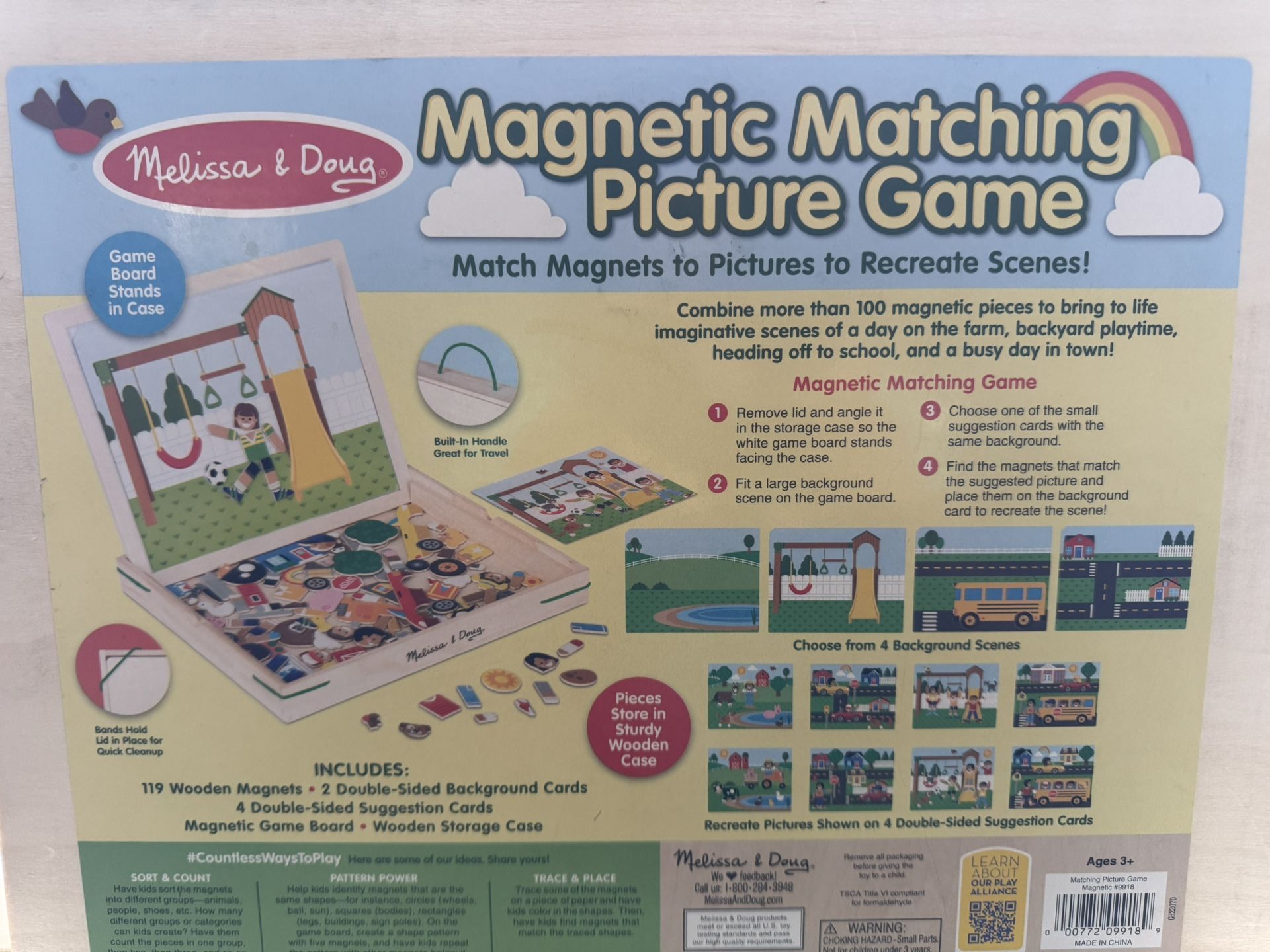 This has been opened, but never used. All the pieces are all there. Includes 119 wooden magnets, 2 double-sided background cards, and 4 double-sided suggestion cards. Magnetic game board and wooden storage case.