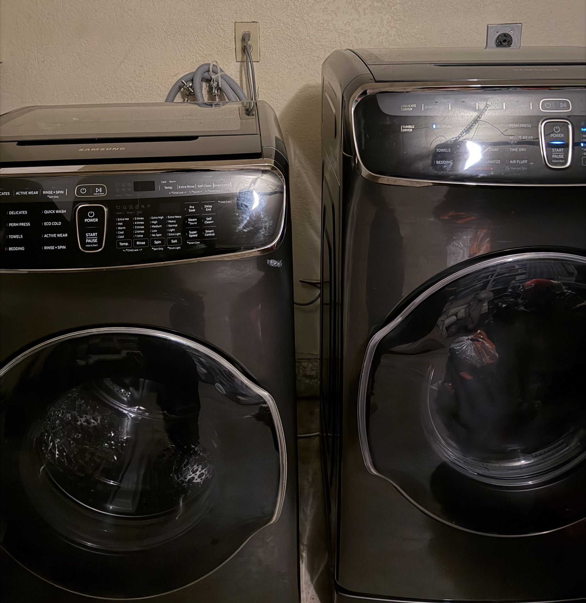 Double, front and bottom load washer and dryer. Does 2 loads of laundry at once. Black stainless steel. Connects to WiFi, great condition.