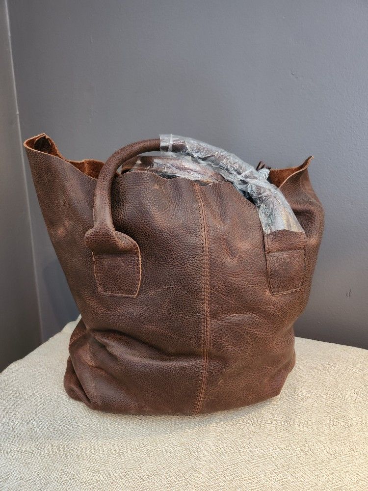 If listing is still up, it's still available! Price is firm. Brand new, never used. Extra large leather tote with detachable denim insert. Real leather, very sturdy! 16" wide, 14" tall