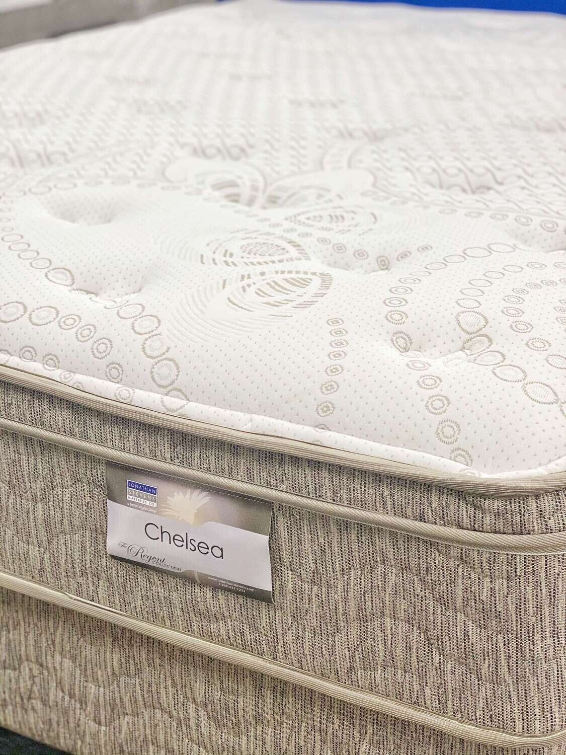 Used, but still in great condition. Only used for about 1 year. Normally retails for $1,169.95. This is the Chelsea Mattress from The Regent Collection, purchased from Jonathan Stevens Mattress Company Per the website description: The Chelsea mattress starts with our exclusive, firm continuous coil ComfortFlex Innerspring system which supports you with no twisting or sagging and delivers perfectly even sleeping for two. We then add two high-density firm layers of cushioning before we place a layer of superior pressure-relief all pure latex which reduces tossing and turning and alleviates pressure points to help bring oxygen and nutrients to muscles. Latex is antimicrobial, dust mite and mildew-resistant with a breathable cell structure—warmer in winter, cooler in summer. We top the supportive mattress with the perfect complimentary cover that has two additional soft, body-contouring layers of cushioning material quilted into it. Feature #1 The finest pillowtop mattress made for the most comfortable night's sleep that you can imagine. Feature #2 Continuous coil innerspring system for optimum support with edge to edge coverage for maximum sleeping area. Feature #3 Additional layers of premium density cushioning material and specialty foams and latex.