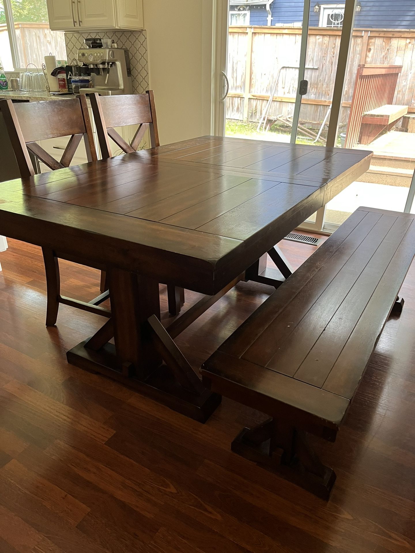 Dining room set. Includes table, chairs, bench, cabinets and mirror Dining set was originally $1200 from world market in woodinville