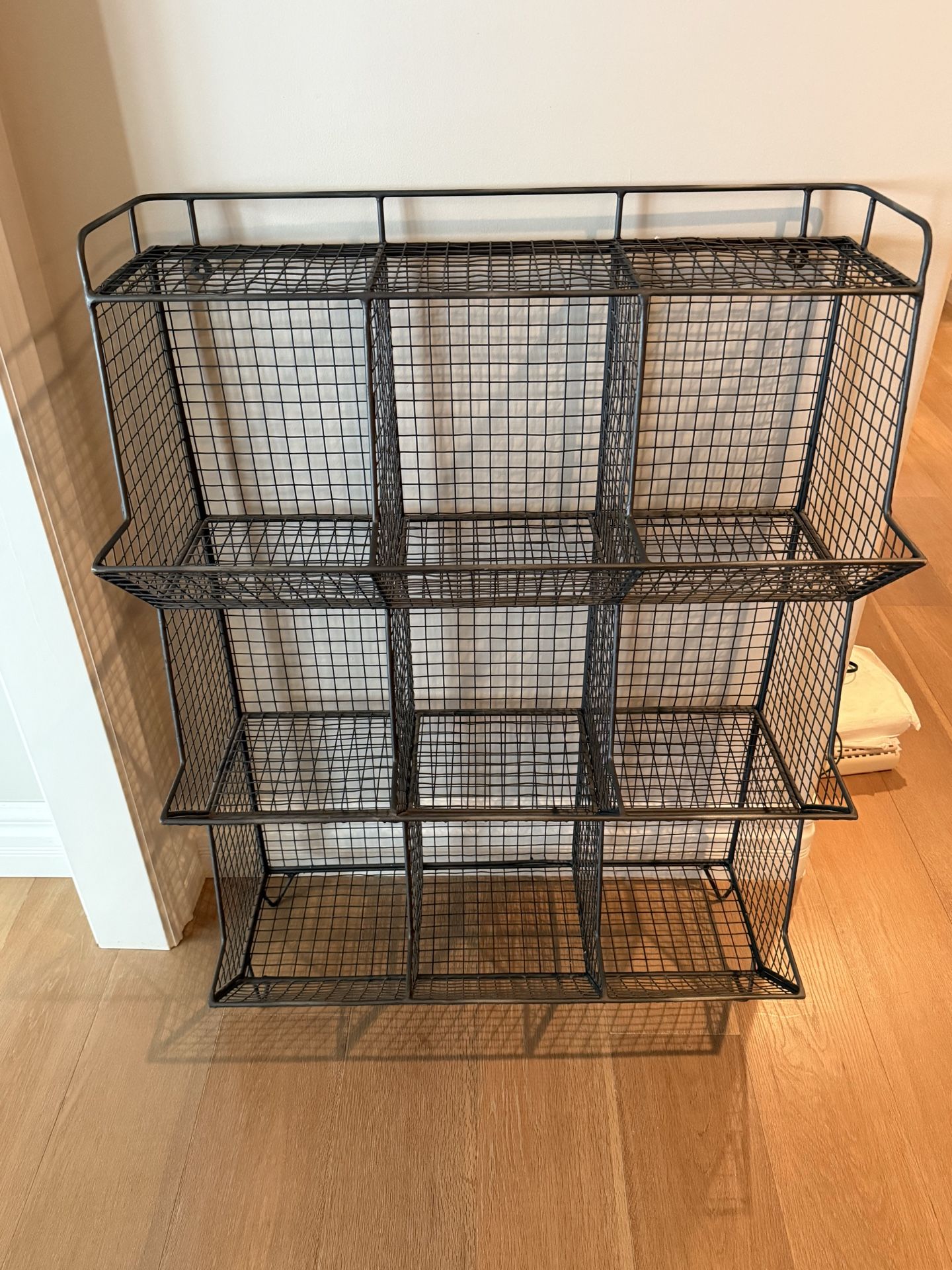 Restoration hardware toy bin with nine compartments. Can be placed on floor or hung on the wall. Dimensions are 42 1/2 inches high by 29 1/2 inches wide by 13 1/2 inches deep. In like new condition, no dents scratches or paint crayon etc. marks.