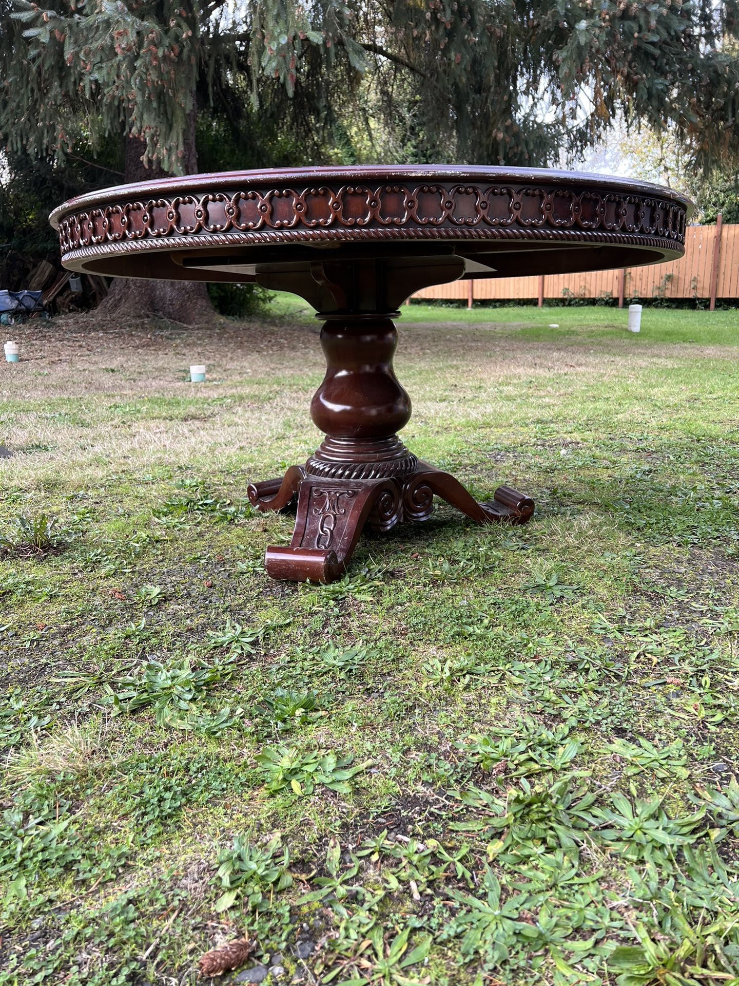 Round Dinner Table. Pics have dimensions. Missing the four bolts that secure the tabletop to the stand. Not sure of the wood type. Pick up only. No Delivery