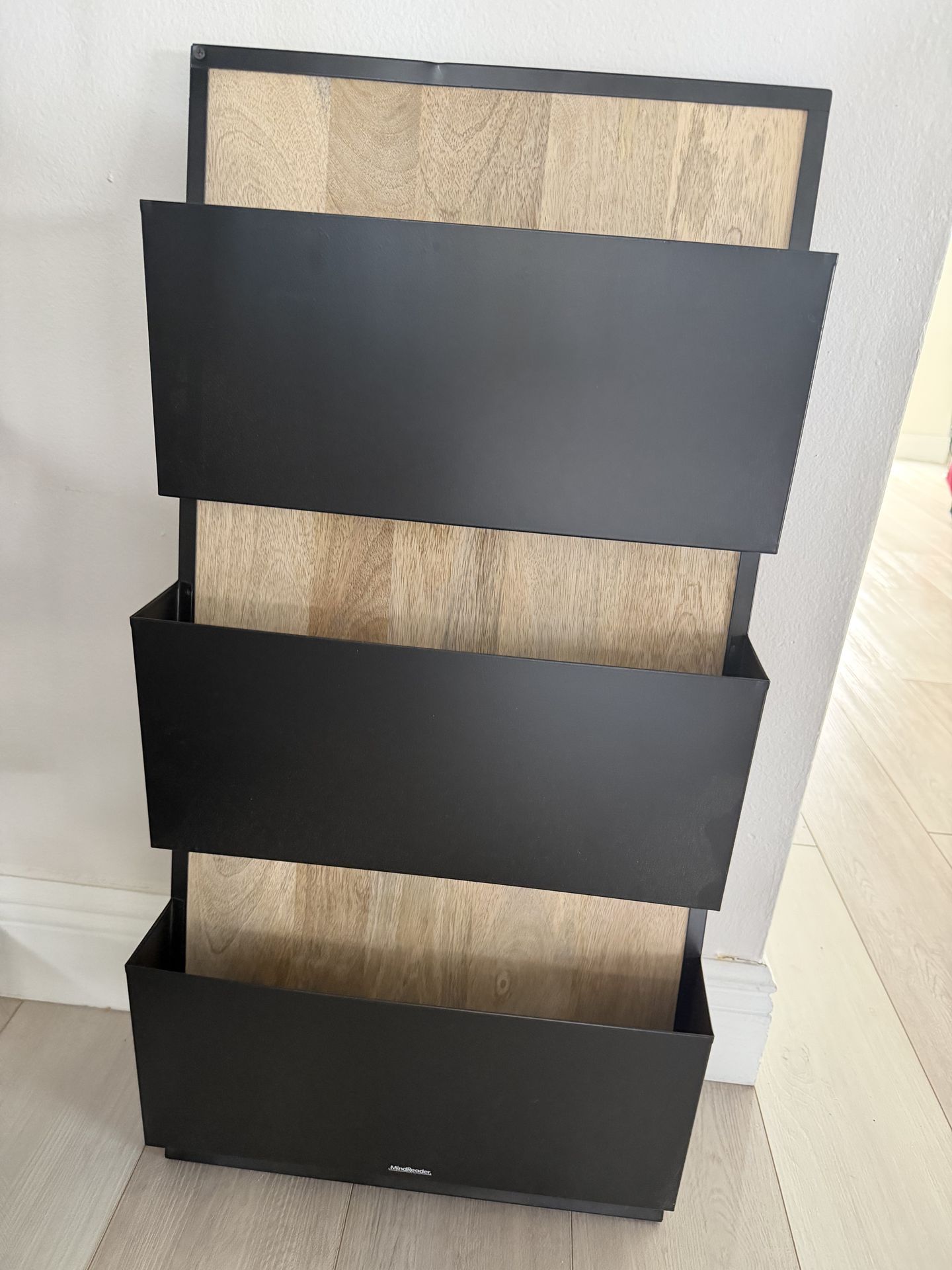 3 Tier wall mounted file organizer. Wood with metal frame. Including the hanging hardware. Great for home office, mail, files and folders.