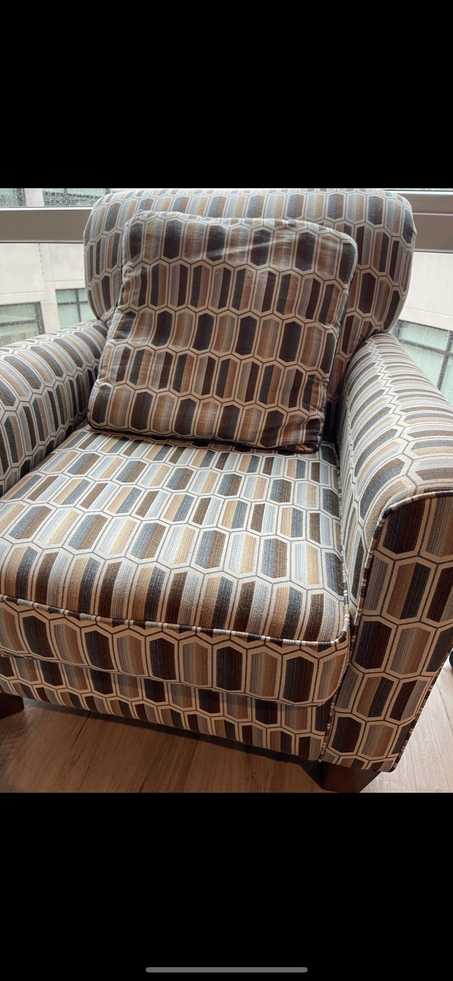 Good condition used accent chair with matching pillow 35 H 35 W 36 D Plush cushioning Polyester Material