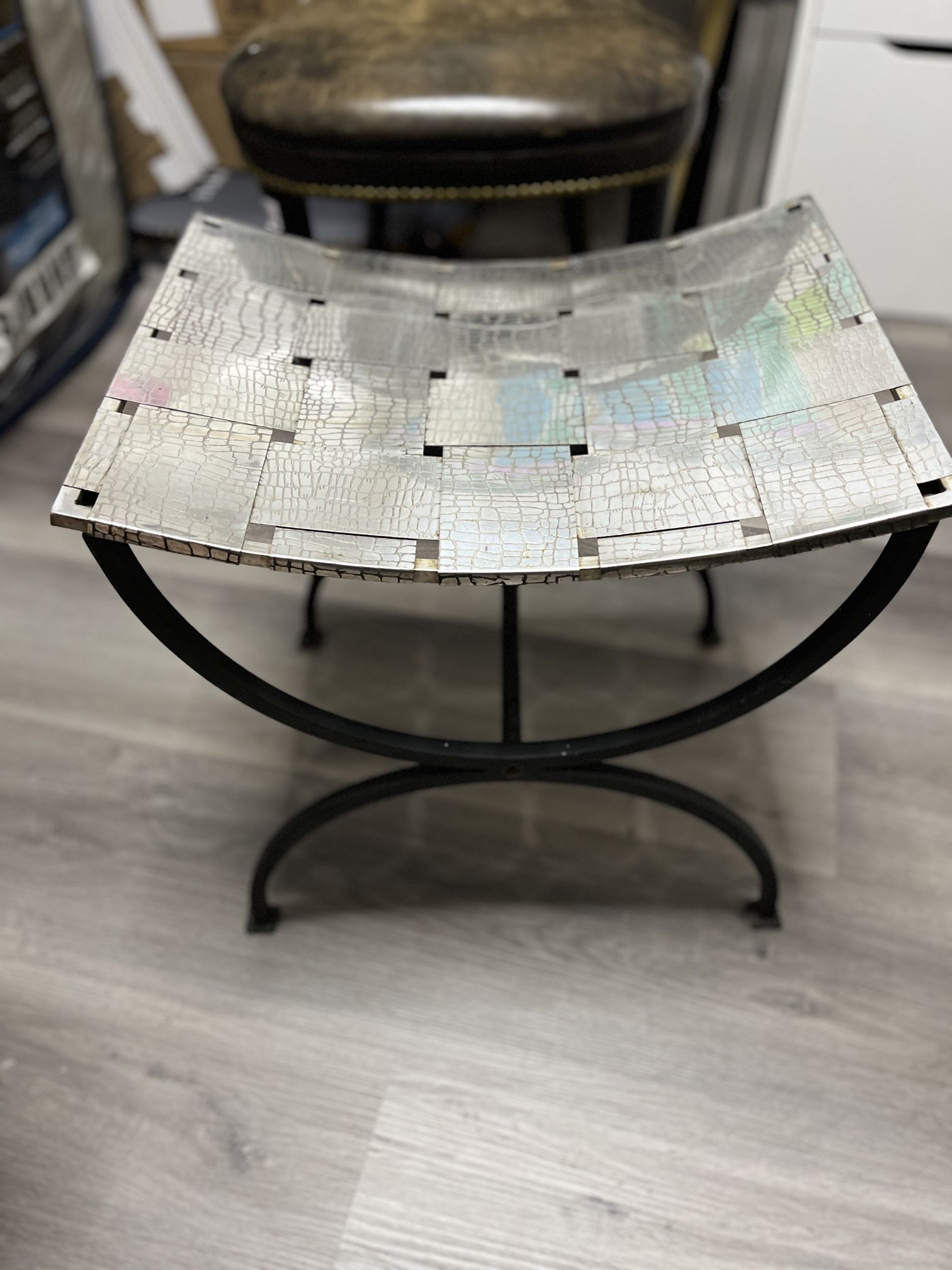 Metal & iron seat/vanity stool or ottoman, Large decorative bowl, 5x7 frame, tray & 4 piece Goldinger coaster set. All are made from metal & have a textured crocodile/alligator print. *Items priced separately. Frame $12 4pc Coaster Set $12 Tray $12 Bowl $20 Vanity Seat/Ottoman $50 Or all 8 pieces for $95