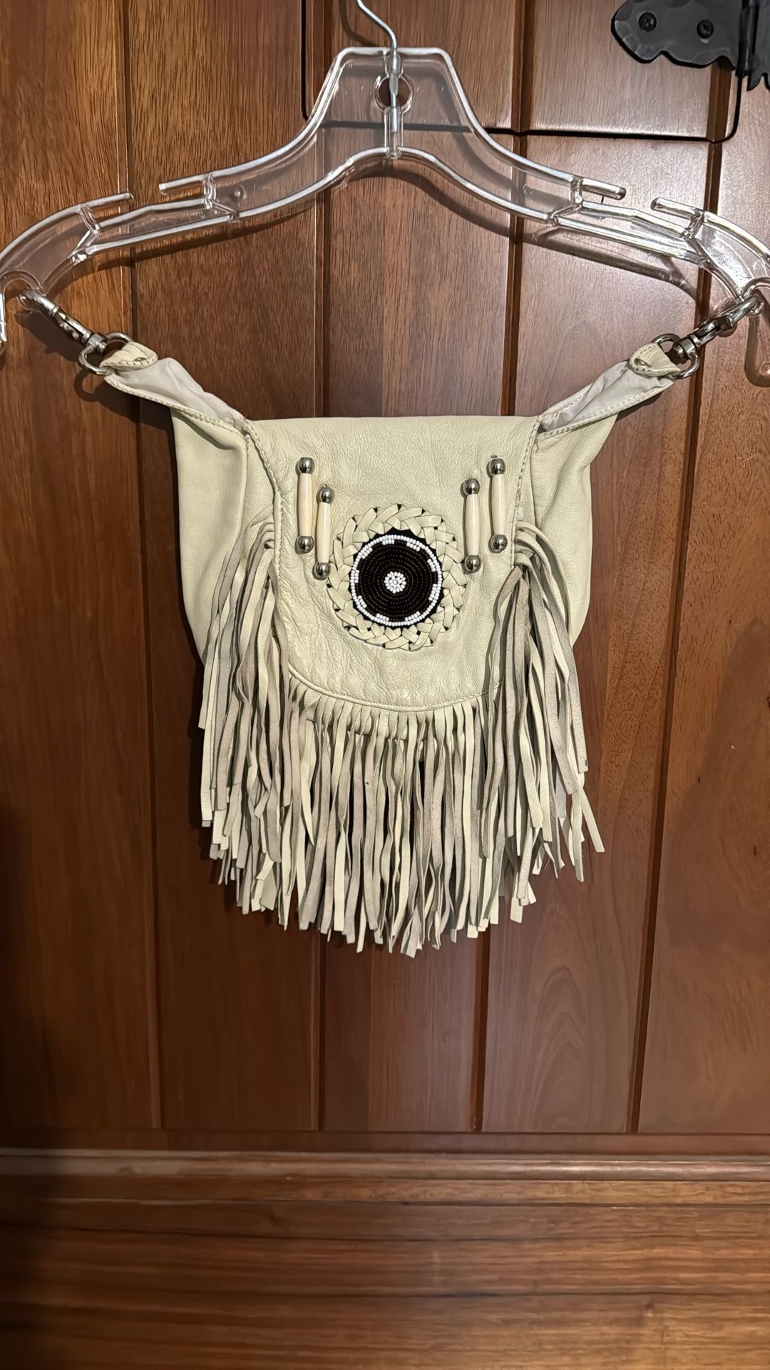 Leather Bag with fringe - Hip Jeans Loop Belt Bag Braided Bead Hand Work Hand Crafted Design Women Clipon Leather ivory colored Fanny Pack for Women Made In Pakistan - missing strap