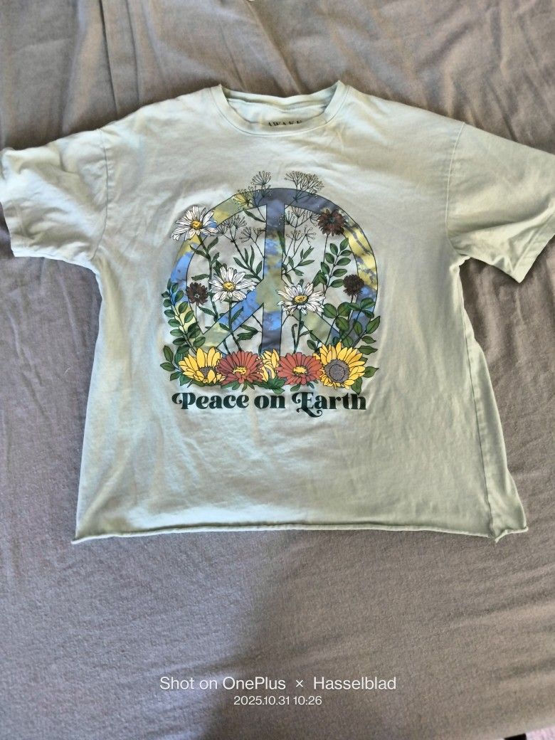 White Shirt Says, Peace On Earth, By Awake Women's Size Medium