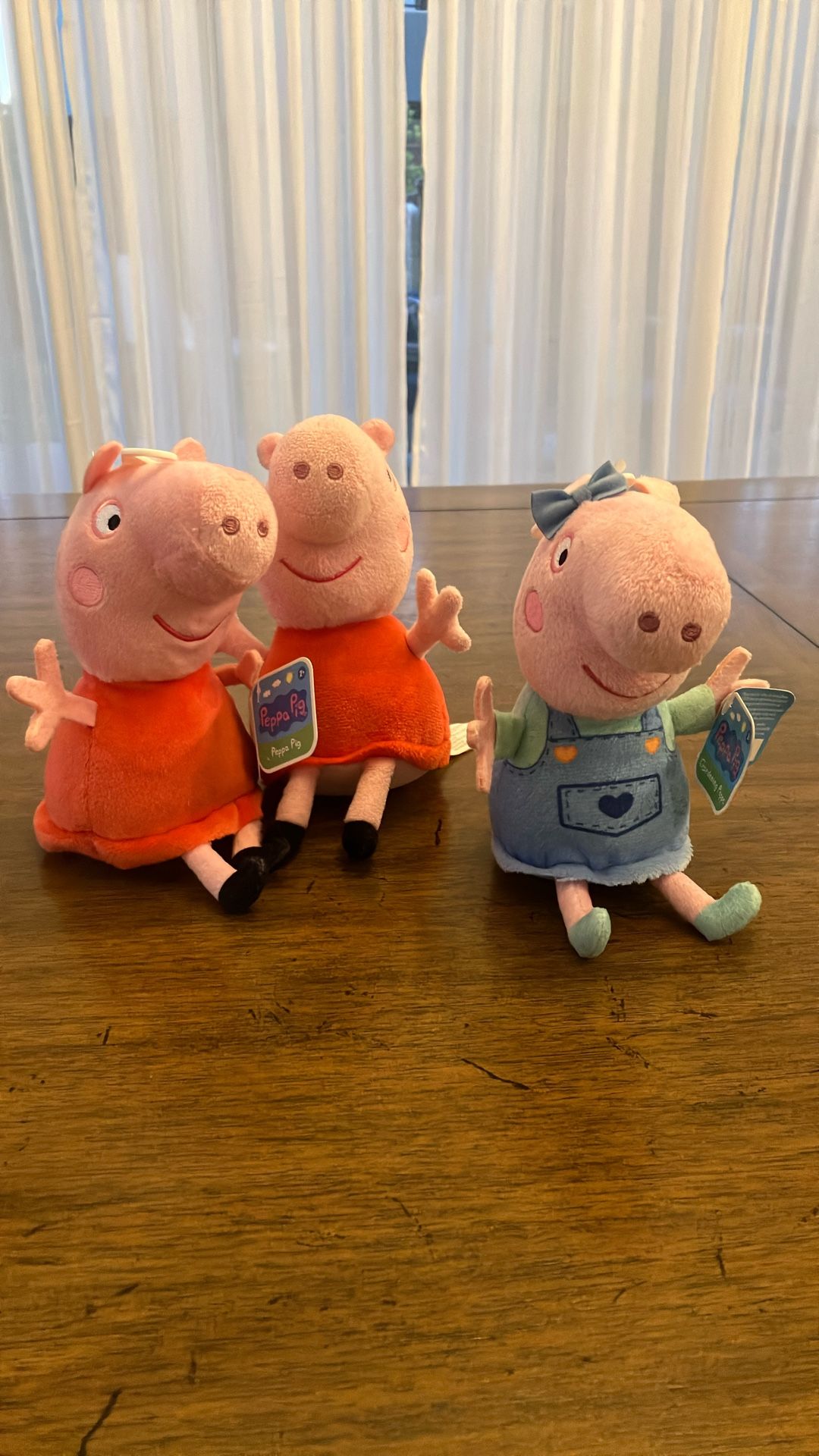 Bring the world of Peppa Pig home with this adorable trio of plush toys! This set includes three different Peppa variations, featuring her classic look and a special gardening outfit. These are the perfect size for toddlers to carry, cuddle, or take on "muddy puddle" adventures. Product Details • Characters Included: * 2 x Classic Peppa Pig (Red Dress) • 1 x Gardening Peppa Pig (Blue Overalls & Bow) • Condition: Excellent/Like New • Size: Approximately 6–8 inches tall (perfect for small hands). • Material: Super soft, high-quality plush fabric with embroidered facial features.