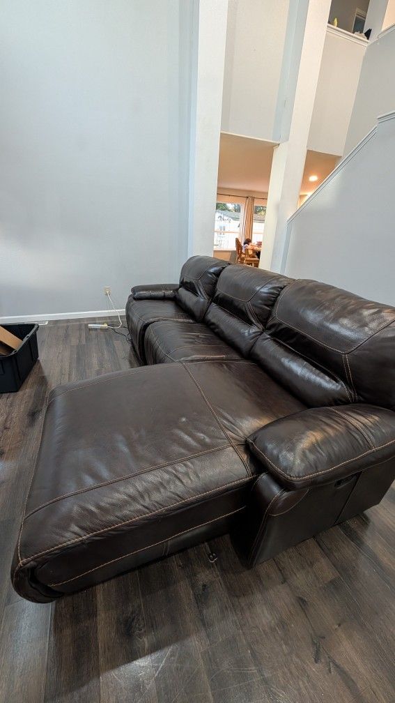 Real leather sectional sofa in dark brown. Includes an electric reclining footrest that still works perfectly and extends electronically. Very comfortable and spacious, great for living room or family room. Modular pieces can be rearranged. There is visible wear and tear on some areas of the leather (see photos), mostly cosmetic. Structurally solid and fully functional. Good option for someone who wants real leather and comfort at a great price and doesn’t mind some cosmetic flaws. Pickup only. Bring help to load. Long section: 41” D x 70” W Two smaller sections: 32” D x 40” W each