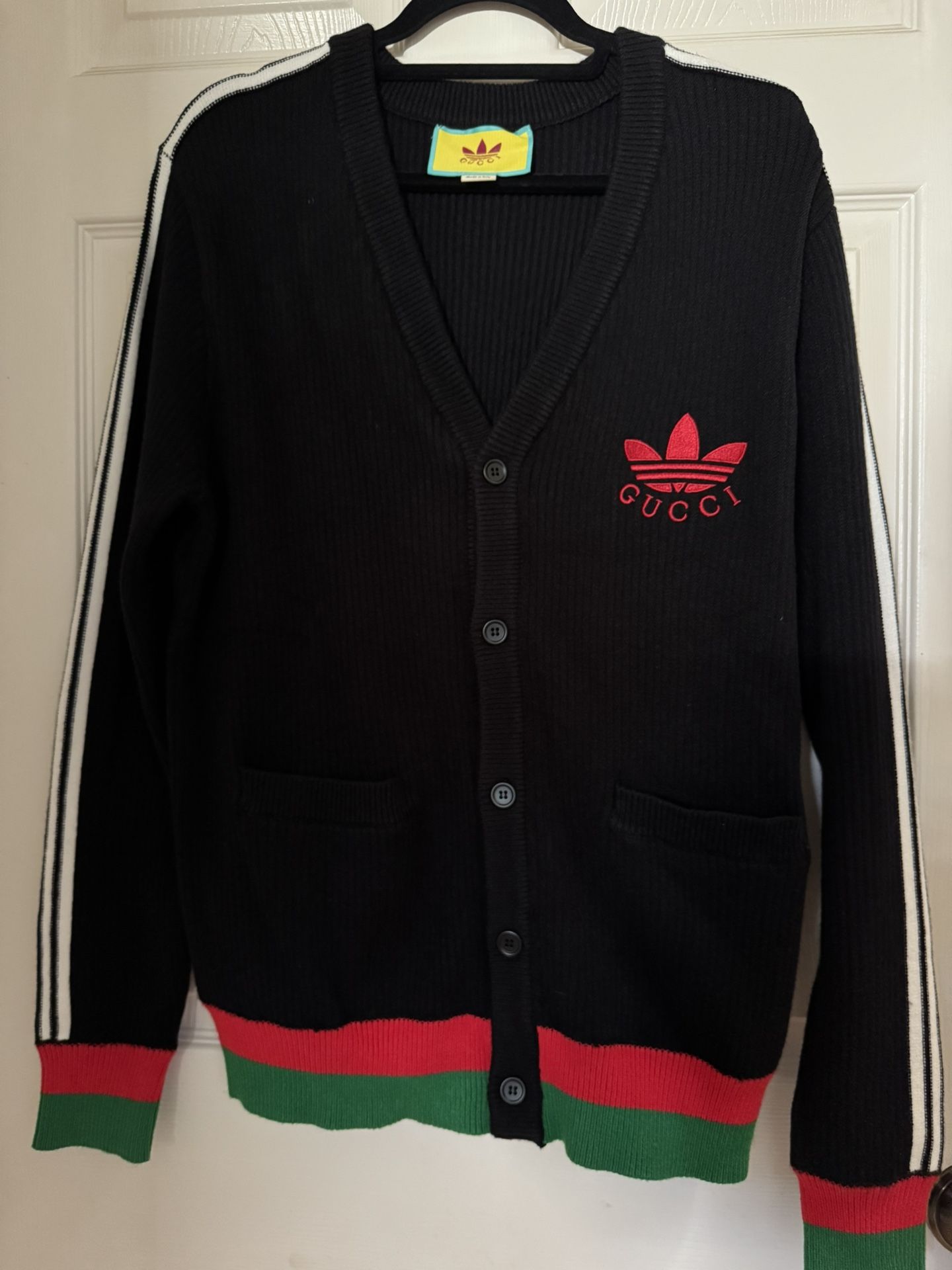GG 100% Cotton Black Button Front Logo Cardigan New with tag. Men size: S 100% Cotton Can be worn by men or women Measurements: Under armpits across: 20” Length: 26”