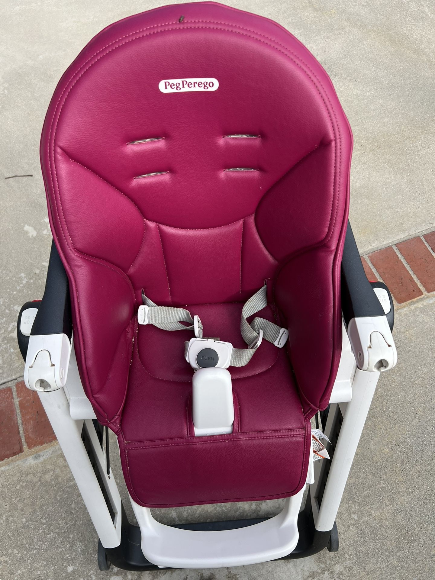 Pre-loved but well cared for and super clean high chair. The seat cover( beautiful cherry color) and 5-point harness replaced about a year ago. Make an offer!