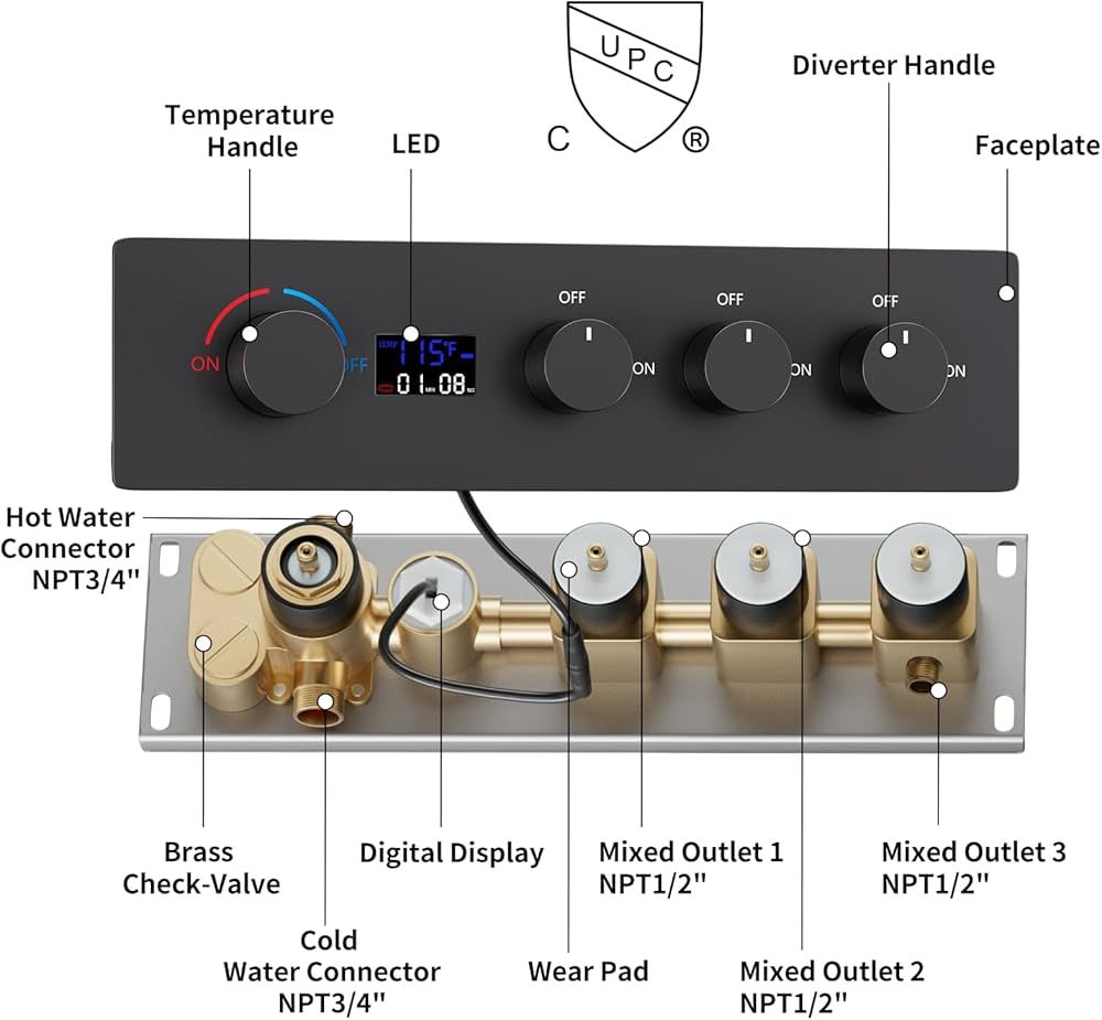 Brand new in box Pick up only 3 Function Shower Valve】3-way digital thermostatic shower valve provides precise temperature control, water flow customization, safety features, and convenience, enhancing your showering experience 【Knob On-off & Flow Control】3 function shower diverter valve not only control individual functions, but also adjust the flow rate of individual shower functions 【Temperature Digital Displayl】The intimate temperature display function displays the current water temperature in real time and action time, and automatically lights up when the water is turned on, Built-in hydroelectric generator Hydropower 【Safe&Durable】Equipped with a pressure-balanced valve, our shower diverter prevents scalding accidents by maintaining a constant water temperature. High quality solid brass construction, extending the life of shower valve