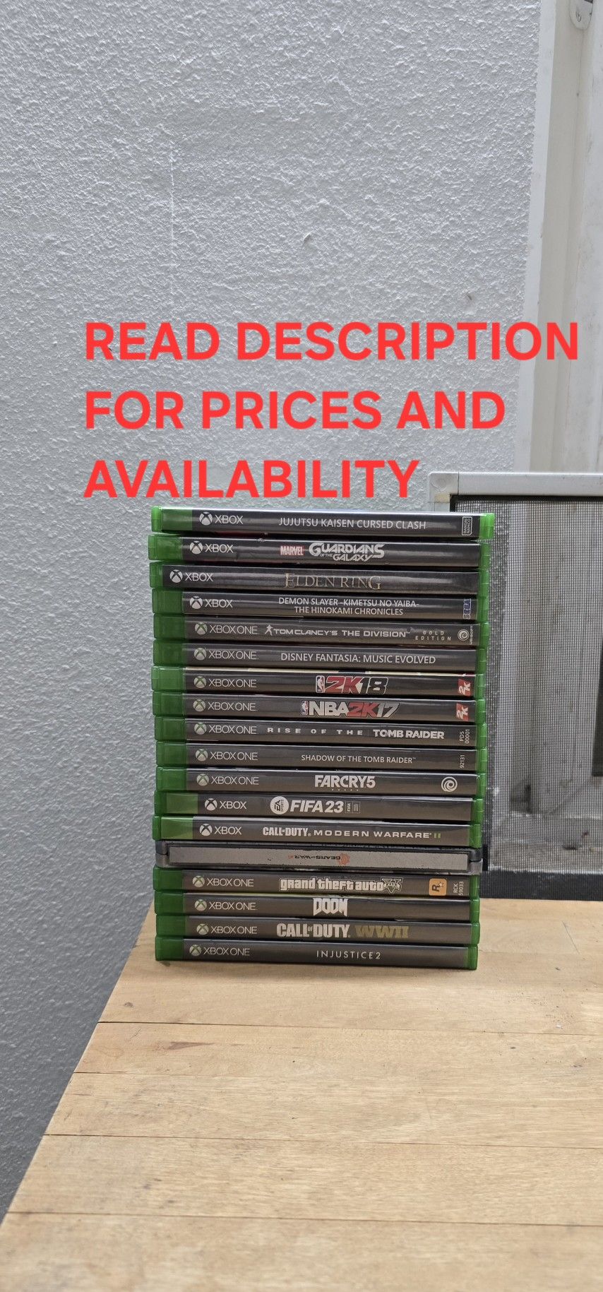 IF YOU DON'T SEE IT IN THE LIST BELOW, IT'S SOLD ! Price for each game is firm. All are in good condition and works fine. Call of Duty Modern Warfare II: $20 Call of duty WW II: $10 DOOM: $10 FIFA 23: $15 GTA V: $15 Demon Slayer Kimetsu no Yaiba - The Hinokami Chronicles: $20 Disney Fantasia Music Evolved: $10 DOOM: $10 Farcry 5: $10 Elden Ring: $29 Gears of war 4 with steel book case: $10 Jujutsu Kaisen: Cursed Clash: $15 Marvel's Guardians of the Galaxy: $10 NBA 2K17: $7 NBA 2K18: $10 Rise of the Tomb Raider: $7 Shadow of the Tomb Raider: $10