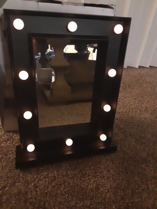 Elevate your vanity setup with this gorgeous Hollywood-style makeup mirror! Perfect for getting that flawless makeup application or just adding a touch of glam to your room. Details: Lighting: Features 10 soft LED bulbs for bright, even lighting. Portable: Battery-operated (requires 2 AA batteries), so no messy cords or looking for an outlet! Size: Perfect tabletop size for desks, vanities, or dressers (14.17" \times 10.63" \times 1.77"). Condition: Excellent condition, comes in the original box.