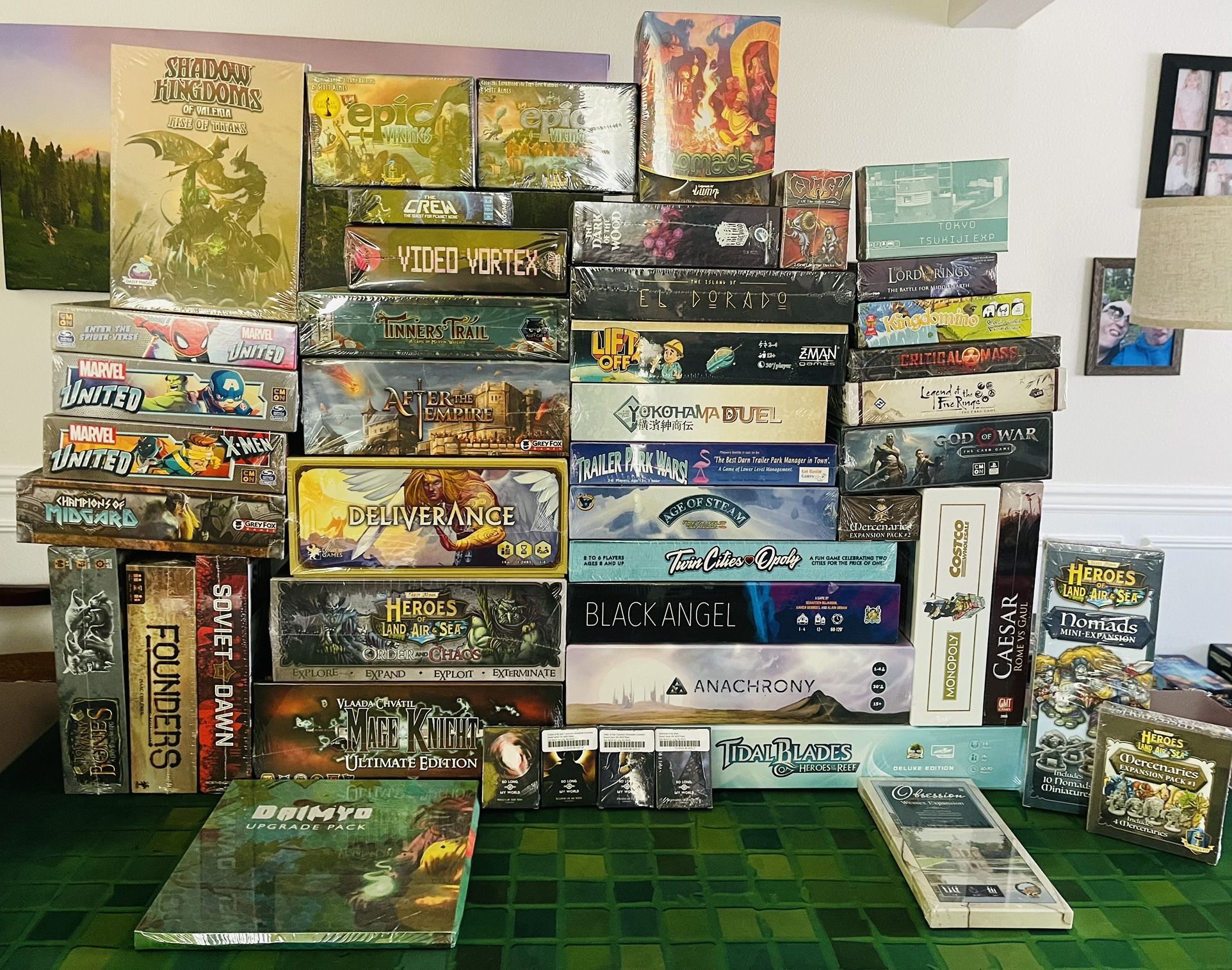 These games are all brand new in shrink wrap. Local pickup in Puyallup or ship from 98374. $45 - After the Empire (New in shrink) $15 - Age of Steam Expansion: Time Traveler (New in shrink) $50 - Anachrony (New in shrink) – Includes the Doomsday Expansion & Chronobot Solo Variant $25 - Black Angel (New in shrink) $70 - Caesar: Rome vs Gaul (New in shrink) $30 - Champions of Midgard (New in shrink) $5 - Clash of the Battle Goats (New in shrink) $20 – Costco Monopoly (New in shrink) $15 - Critical Mass: Patriot vs Iron Curtain (New in shrink) $10 - Daimyo: Upgrade Pack (New in shrink) SOLD - Deliverance (Kickstarter Deluxe Edition - New in shrink) $25 – Founders of Gloomhaven (New in shrink) $20 - God of War: The Card Game (New in shrink) $5 - Heroes of Land, Air & Sea: Mercenaries Expansion Pack #1 (New in shrink) $5 - Heroes of Land, Air & Sea: Mercenaries Expansion Pack #2 (New in shrink) $12 - Heroes of Land, Air & Sea: Nomads Mini-Expansion (New in shrink) $50 - Heroes of Land, Air & Sea: Order and Chaos (New in shrink) $15 - Kingdomino (New in shrink) $20 - Legend of the Five Rings: The Card Game (New in shrink) $20 - Lift Off (New in shrink) $150 - Mage Knight (Ultimate Edition – New in shrink) $25 - Marvel United (New in shrink) $15 - Marvel United: Enter the Spider-Verse (New in shrink) $25 - Marvel United: X-Men (New in shrink) $5 – Nomads (New in shrink) SOLD - Obsession: Wessex Expansion (Deluxe 2nd Printing - New in shrink) $30 - Shadow Kingdoms of Valeria: Rise of Titans (New in shrink) $15 - So Long, My World: Defier of Fate (New in shrink) $15 - So Long, My World: Eclipse of My Soul (New in shrink) $15 - So Long, My World: Remnants of the Moon (New in shrink) $15 - So Long, My World: Wells of the Sun (New in shrink) $50 - Soviet Dawn: The Russian Civil War 1918 to 1921 (Deluxe Edition – New in shrink) $10 - The Crew: The Search for Planet Nine (New in shrink) $20 - The Island of El Dorado (New in shrink) $15 - The Lord of the Rings: The Battle for Middle-Earth (New in shrink) $15- Thornwatch: The Dark of the Wood Expansion (New in shrink) $60 - Tidal Blades: Heroes of the Reef (Part 1 Deluxe Edition – New in shrink) SOLD - Tinners’ Trail (Second Edition - New in shrink) $20 - Tiny Epic Vikings (Deluxe Edition – New in shrink) $10 - Tiny Epic Vikings: Ragnarok (New in shrink) $20 - Tokyo Tsukiji: Expansion (New in shrink) SOLD - Too Many Bones (New in shrink) SOLD - Trailer Park Wars! (New in shrink) – Includes extra 100 pink yard flamingos $15 - Twin Cities Opoly (New in shrink) $20 - Video Vortex (New in shrink) $45 - Yokohama Duel (Deluxe Edition – New in shrink)
