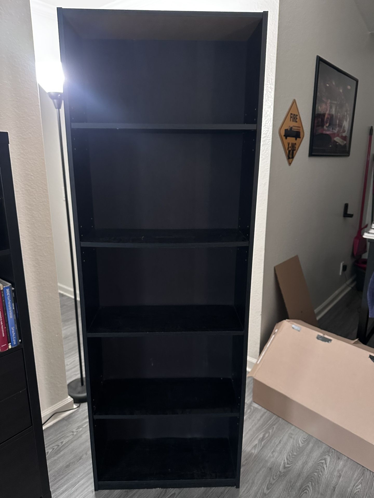 Black bookcase. Bought 10 +/- years ago from Target. Still sturdy and in good condition. Normal wear and tear, some cosmetic damage such as scratches. Comes from a non smoking household. Some of the middle shelves bow a little due to weight but they’re still solid. 3 of the shelves are adjustable. Will not deliver.