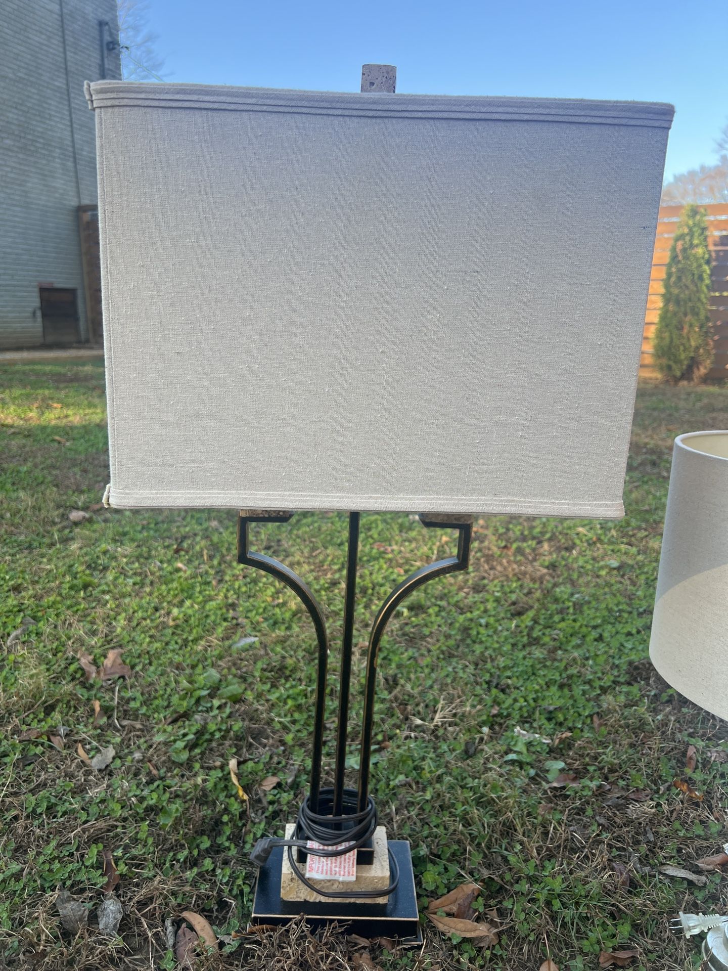 Large lamp in very good condition Dark brown and cream color Measurements 15” x 15” x 31.5” high $40 cash only. Buyer must pickup