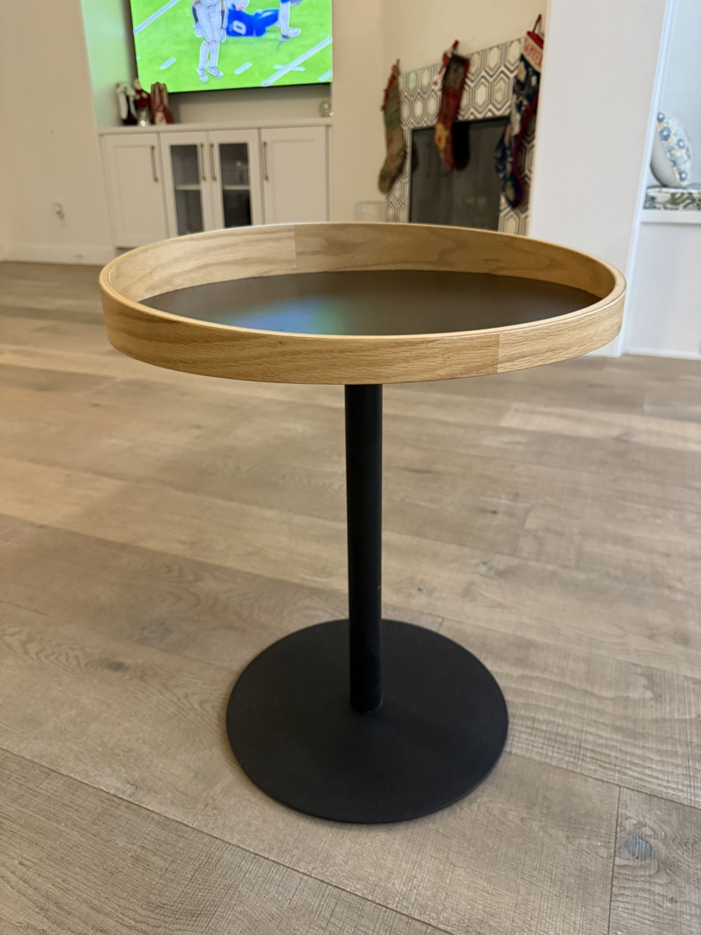 Great end table. Perfect for an office or living room. Lightly used and bought for $185. Moving and need to sell. HomeRoots Amelia 18-in W x 21.5-in H Natural Wood Round Midcentury End Table This crater end table features a sturdy black matte black metal base, a painted black MDF tabletop, and a walnut oak wood veneer rim. This wooden rim is uneven in height around the tabletop offering a unique, mid century modern look while providing a secure environment for valuables. End table features a sturdy black matte black metal base This wooden rim is uneven in height around the tabletop offering a unique, mid century modern look while providing a secure environment for valuables Free, kitchen, chairs, white, fabric, antique, new, delivery, queen, king, sofa, couch, table, tall, bed, twin, bedroom, furniture, ikea, Wayfair, Amazon, cheap, expensive