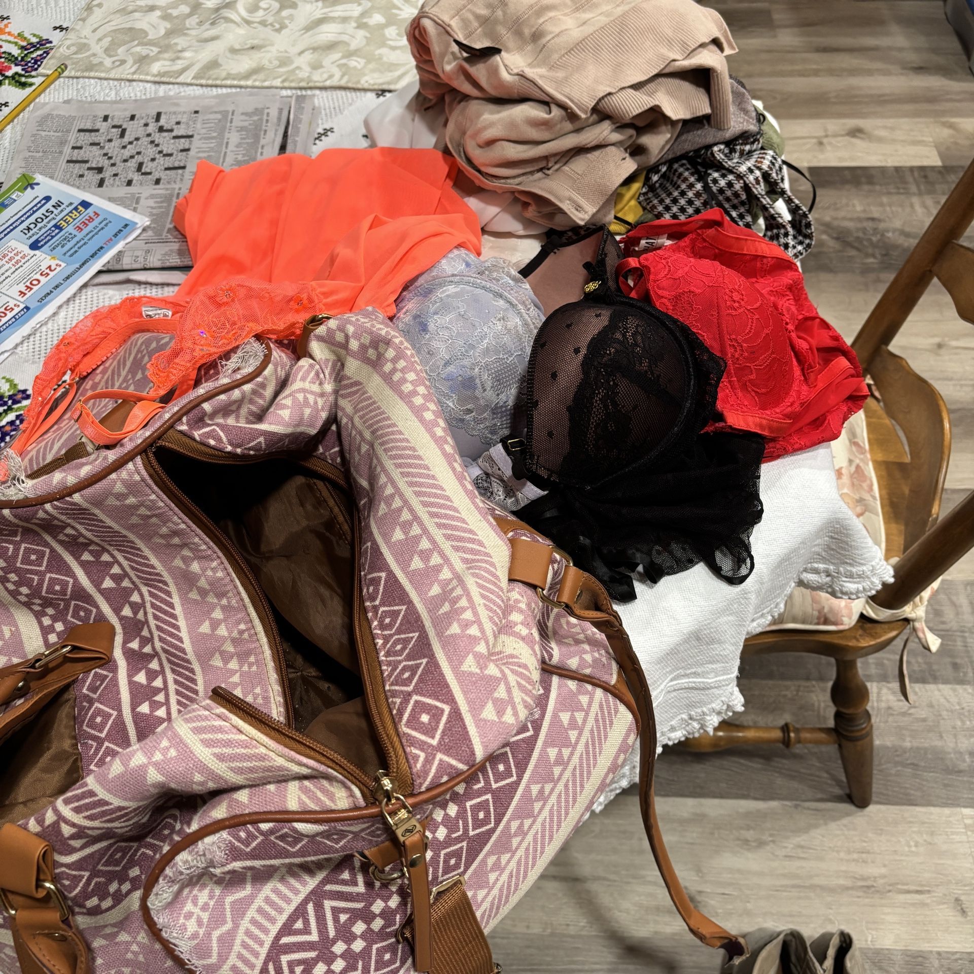 Bag is broken. Clothes need to be washed. Size small and medium.
