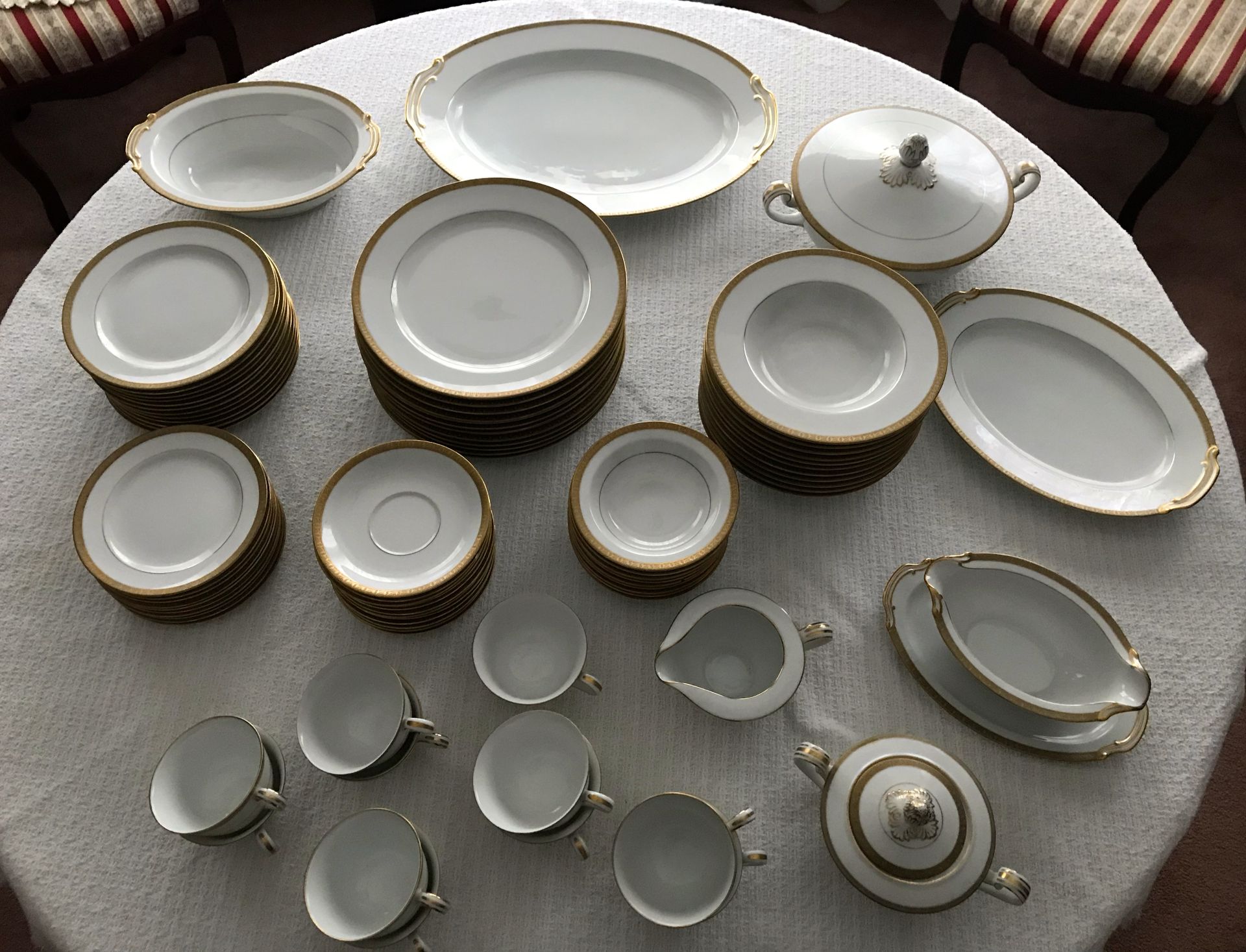 Noritake Bone China - 12 Place Setting and Accessories - 84 Pieces - Occupied Japan - 24-K Gold •Each Piece is Signed: “NORITAKE CHINA”, “M” within the Golden Wreath and “MADE IN JAPAN”. Please See Pictures •Vintage 1(contact info removed) •Purchased in Japan during the Post WWII US Occupation. •From 1921 until the end of WWII Noritake China was signed “M” (for family name Morimura) and “MADE IN JAPAN”. By 1953 the “M” was replaced with an “N” within the wreath •Hand Decorated 24-K Gold •Twelve Dinner Plates - 10 Inches Round •Eleven Soup Bowls - 8 Inches Round •Twelve Salad Plates - 7 1/2 Inches Round •Ten Bread and Butter Plates - 6 1/2 Inches Round •Nine Desert Bowls - 5 1/2 Inches Round •One Large Oval Meat Platter -16 Inches Long by 12 Inches Wide •One Medium Oval Meat Platter - 12 Inches Long by 9 Inches Wide •One Oval Vegetable Bowl - 10 1/2 Inches Long by 8 Inches Wide •One Covered Casserole Dish - 9 Inches Round - 11 Inches to Handles - 6 Inches Tall •One Gravy Boat with Attached Under Plate - 9 Inches Long by 5 Inches Wide by 3 Inches Tall •One Sugar Bowl - 5 Inches Round - 7 1/2 Inches to Handle - 5 Inches Tall •One Creamer - 6 Inches Long to Handle by 4 1/2 Inches Wide •Eleven Cups - 3 1/2 Inches Round - 4 1/2 Inches to Handle •Twelve Saucers - 5 3/4 Inches Round •Very Good if Not Excellent Condition •No Breaks, Chips or Cracks •$1,750 or Best Offer
