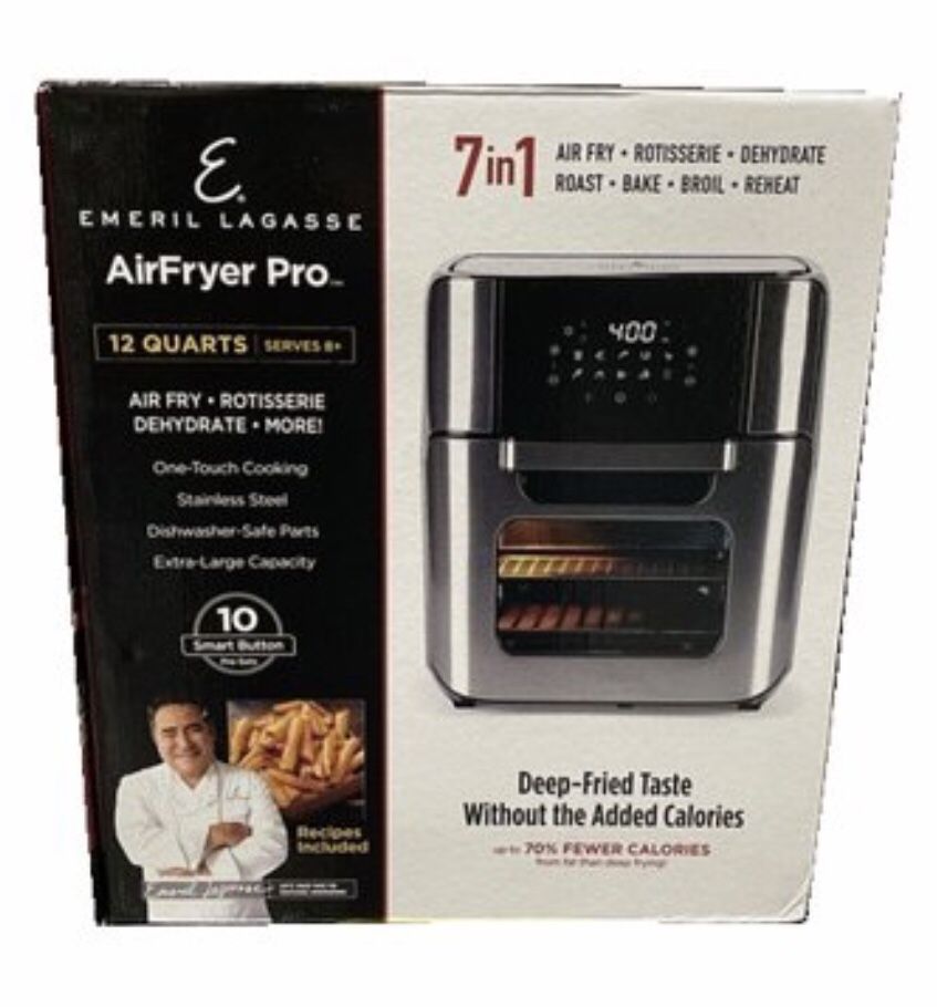 Emeril Lagasse 7 in 1 Air Fry Pro! Hit me up for more info. Retails for $170 with out tax Rotisserie, Dehydrate, Roast, Bake, Broil, and Reheat Easy-Touch Digital Control Panel 10-Presets with Timer and Auto-Shut Off Temperature Range 150° - 400°F Internal Light Brand new - never have been used!