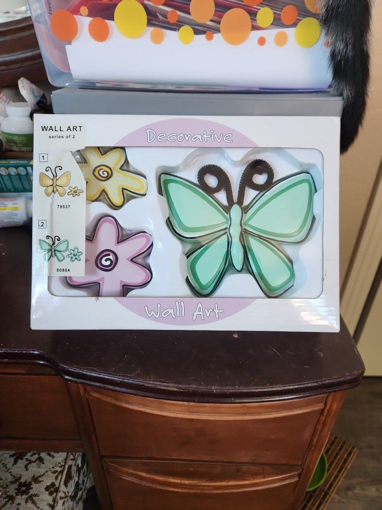 Brand new in original box. Very cute, 3 piece butterfly and flower wall art. Pastels green butterfly, pastel yellow flower, and Pastel pink butterfly. Ceramic set. Puck up only in Fresno on Wednesdays, or in kerman.
