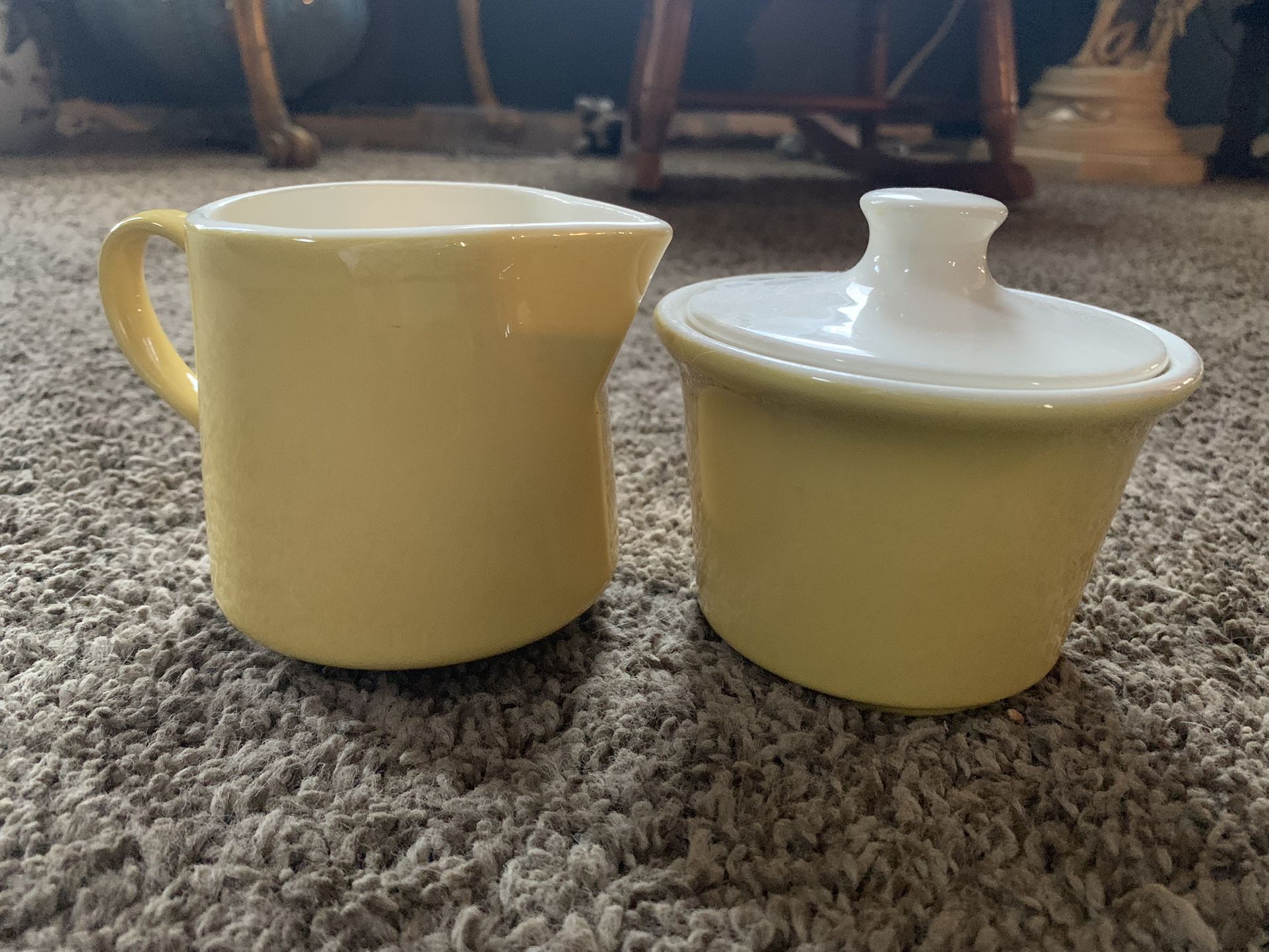 Vintage USA Pottery Yellow & White Creamer and Sugar Bowl Set