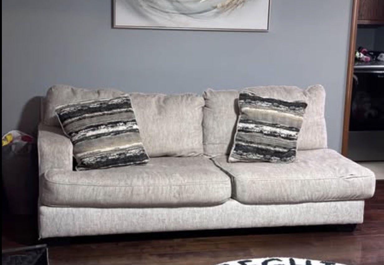 2 piece sectional and oversized ottoman. Right facing loveseat (RFL) and left facing love seat (LFL) in good condition. Wide armrest, deep and plush chenille fabric. Cushion covers unzip and can be thrown in washer and dryer. Multiple configuration options. Specifications and measurements in the pictures. $600 OBO