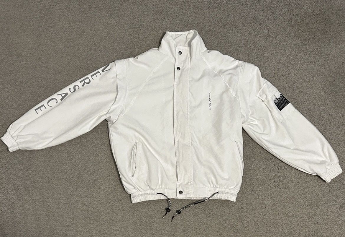 This Men’s Versace Windbreaker in size Large is a stylish and practical choice for casual occasions in the fall season. Made from polyester with a zip closure, it features the iconic Versace logo as accents. The white color and solid pattern give it a sleek and designer look, while the regular fit ensures comfort and a flattering silhouette. Perfect for walking and outdoor activities, this windbreaker is a versatile addition to any man's wardrobe.