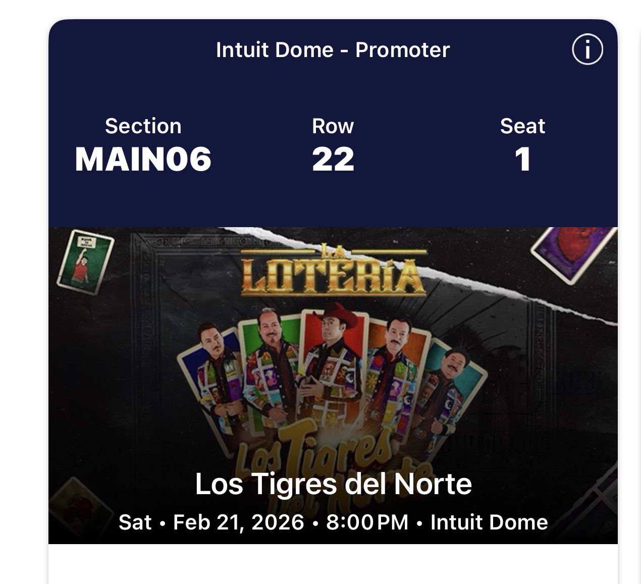 "Vendo 2 boletos para Los Tigres del Norte - Feb 21, Intuit Dome. Sección MAIN06 fila 22 asientos juntos. Interesados mándenme mensaje."