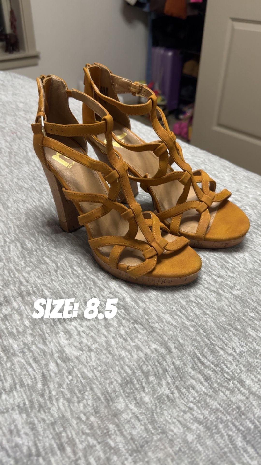 All really cute heels. I’ve only worn the brown one strap heels like twice and the other two I have never worn. Fashionnova accidentally sent me two pairs of the same heels (glass slipper heels) and I have no need for two of them. The yellow brown heels I wanna sell for $12, the brown one strap heels I wanna sell for $12, and the glass slipper heels I would like to sell for $18.