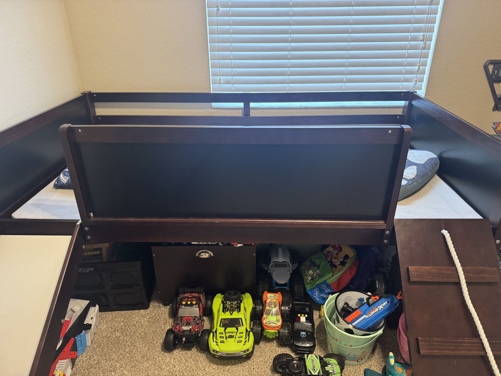 Super fun dark wood twin bed. Has a cool slide and a climbing wall with a rope ladder. Great for kids room and frees up space. Twin size mattress area. mattress not included.