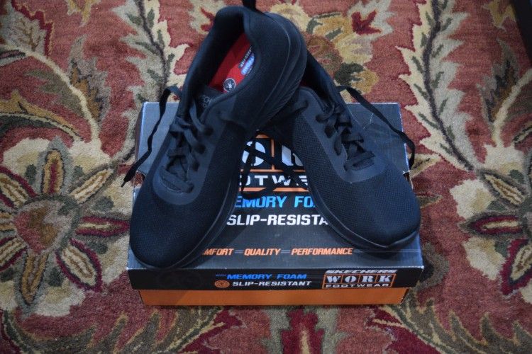 Sketchers nonslip is no joke, I highly recommend them if you work somewhere that you need nonslips. These happened not to fit me. Worn for just one shift. Men's 10.5, women's 12. Feel free to make an offer.