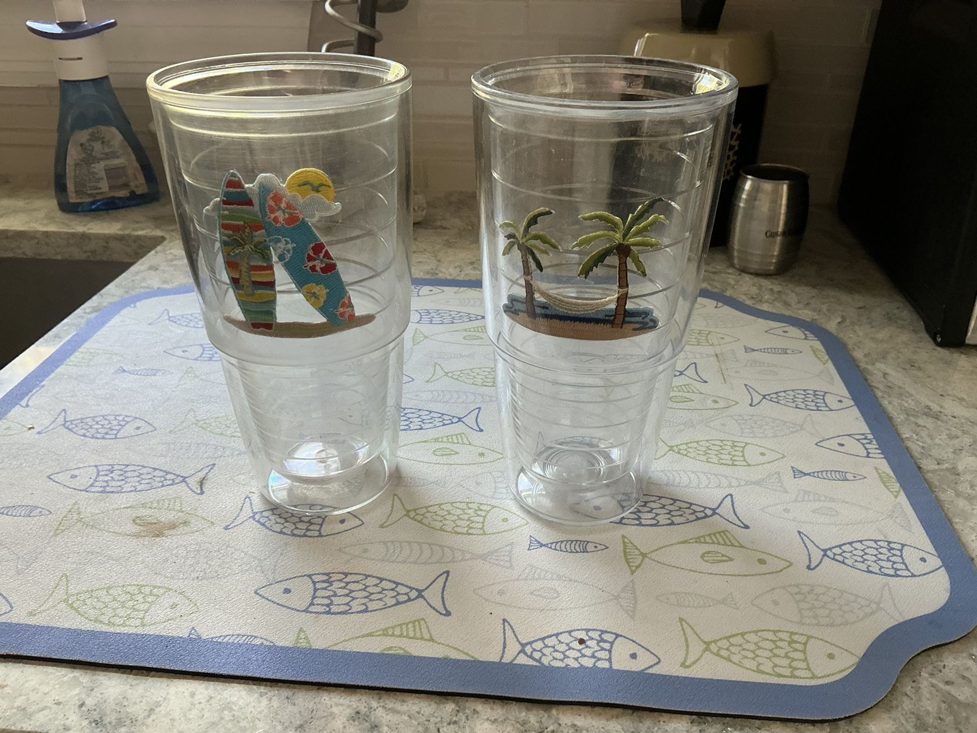 New two 24oz. Tervis double-walled insulated tumblers with a palm tree and hammock design. Made in the USA from durable, BPA-free plastic. Feature double-wall insulation to keep drinks hot or cold longer. Reduce condensation to prevent rings on surfaces. Microwave and top-rack dishwasher safe. Strong, impact-resistant material means they can take a tumble without shattering.