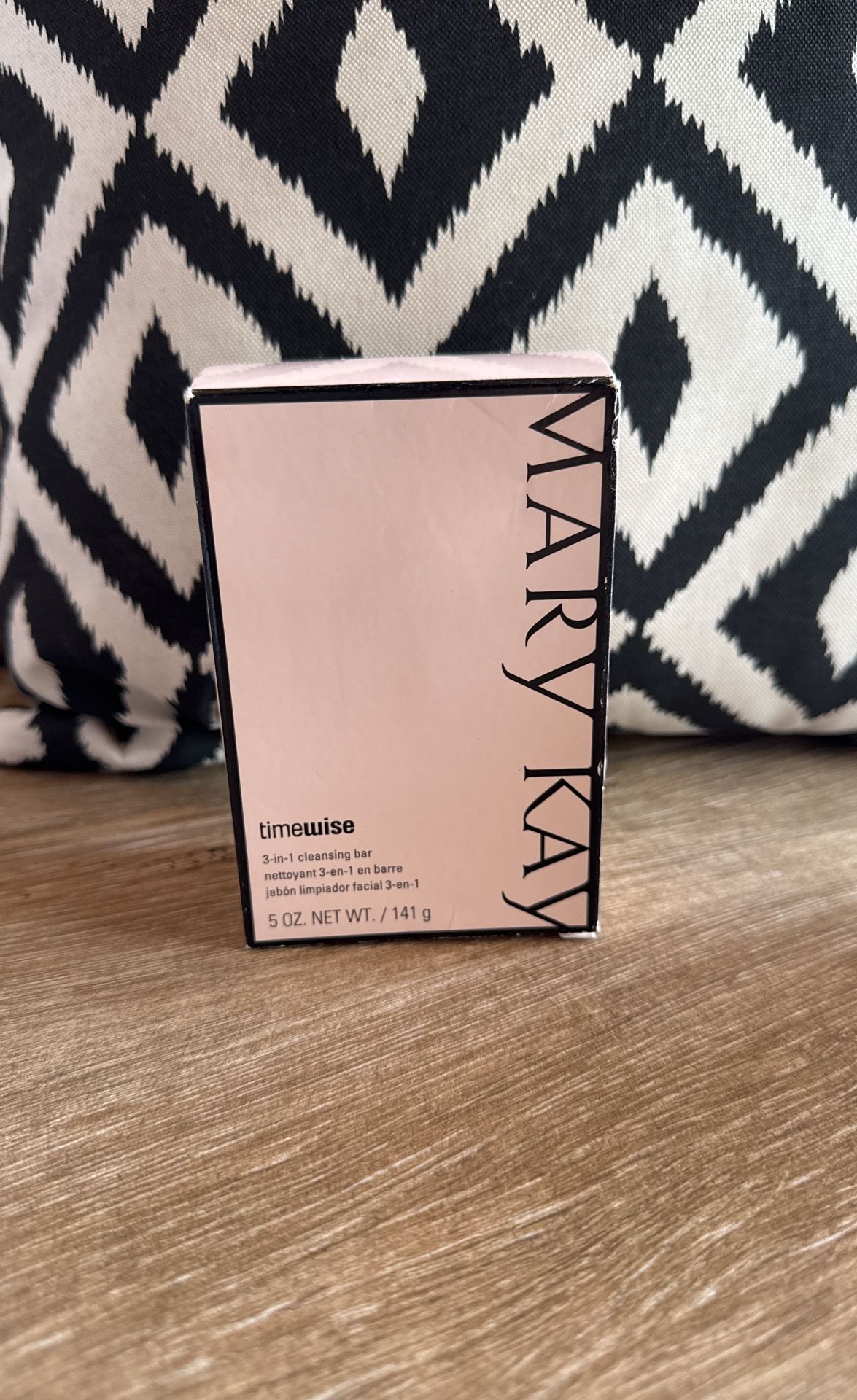 The product shown is Mary Kay TimeWise 3-in-1 Cleansing Bar. It is a skincare product designed to cleanse, exfoliate, and freshen the skin while also targeting the visible signs of aging. Product Type: 3-in-1 cleansing bar Brand: Mary Kay Line: TimeWise Function: Cleanses, exfoliates, and freshens skin Benefits: Helps reduce visible signs of aging, leaves skin soft, smooth, and refreshed Skin Type: Suitable for all skin types, including sensitive skin Features: Oil-free, fragrance-free, dermatologist-tested, hypoallergenic, non-comedogenic Size: 5 oz (141 g)