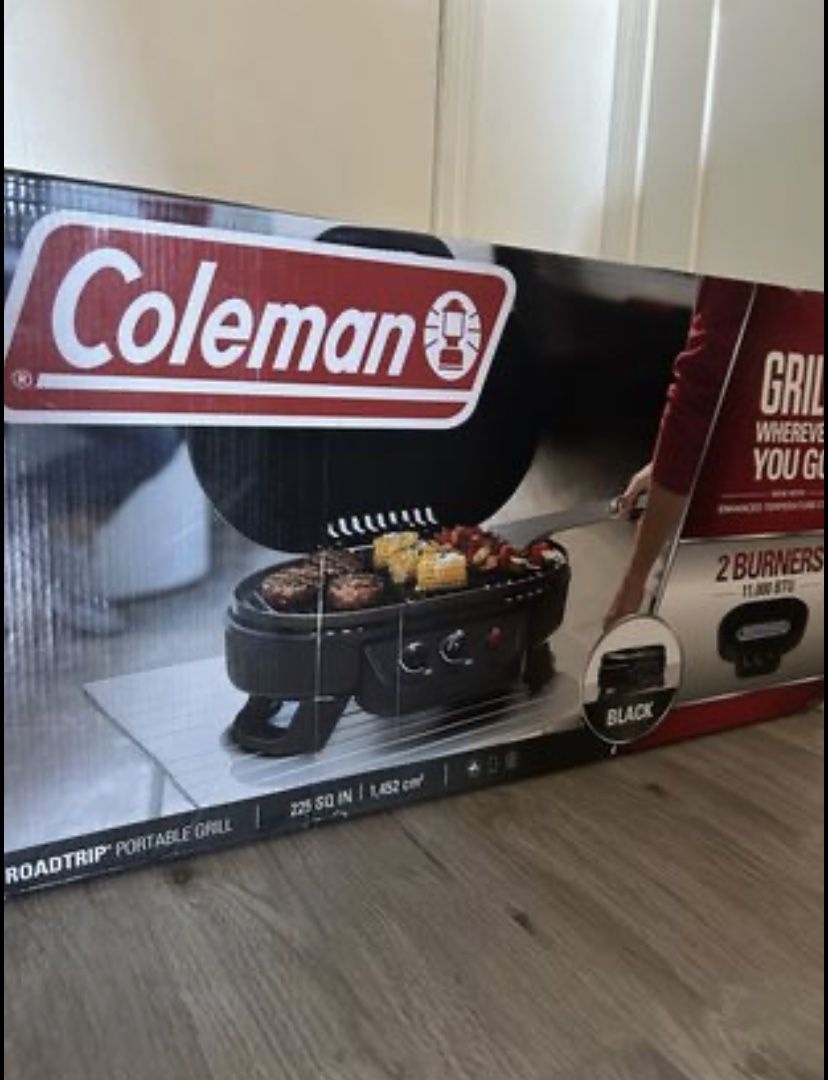 Brand New In the box, never opened Coleman RoadTrip 225 Portable Tabletop Propane Grill, Gas Grill with 2 Adjustable Burners, Instastart Ignition, and 11,000 BTUs of Power 225 Sq. In. Cooking Area BBQ Barbecue Camping, picnic, beach grill, outdoor grill for the park or tailgating