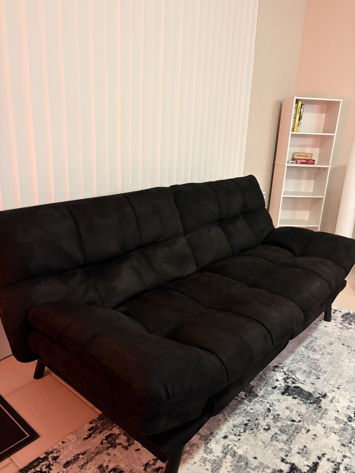 Black fold-out futon with soft material. Great condition and fully clean! Sides of seat fold up/down as well as the entire back that can unfold to lay flat and make a small bed. Cash only and must pickup from Miramar area.