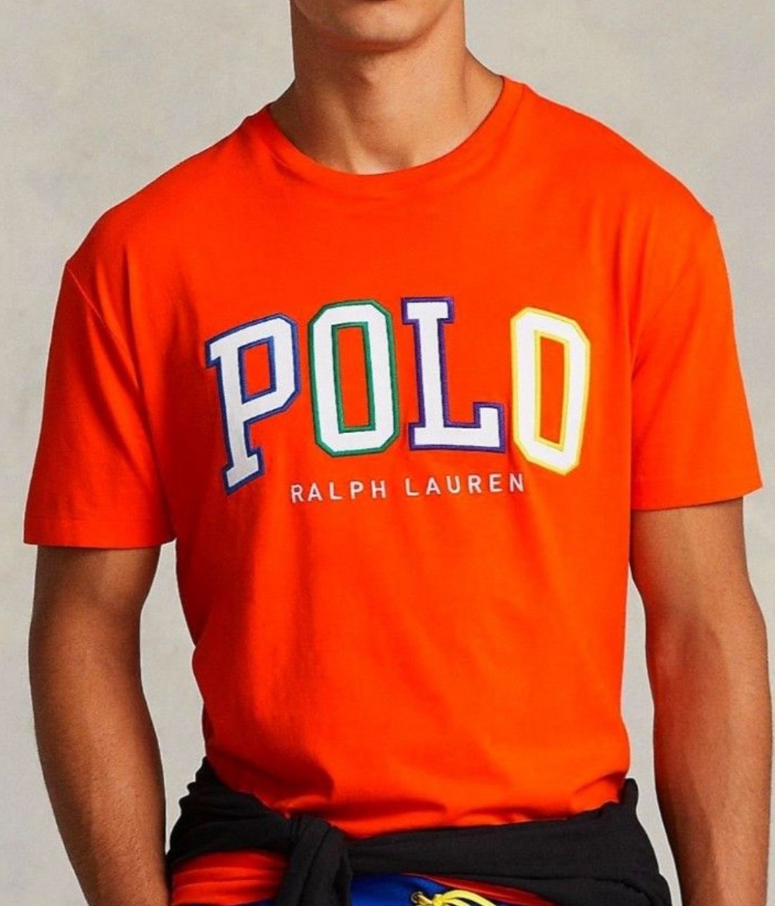 Polo Ralph Lauren ORANGE Classic Multicolor “” Logo Short Sleeve T Shirt (ORANGE) 2XL 100% jersey cotton, multicolor embroidered appliqués around plain print, crewneck, short sleeves, this brand runs large, logo-print t-shirt