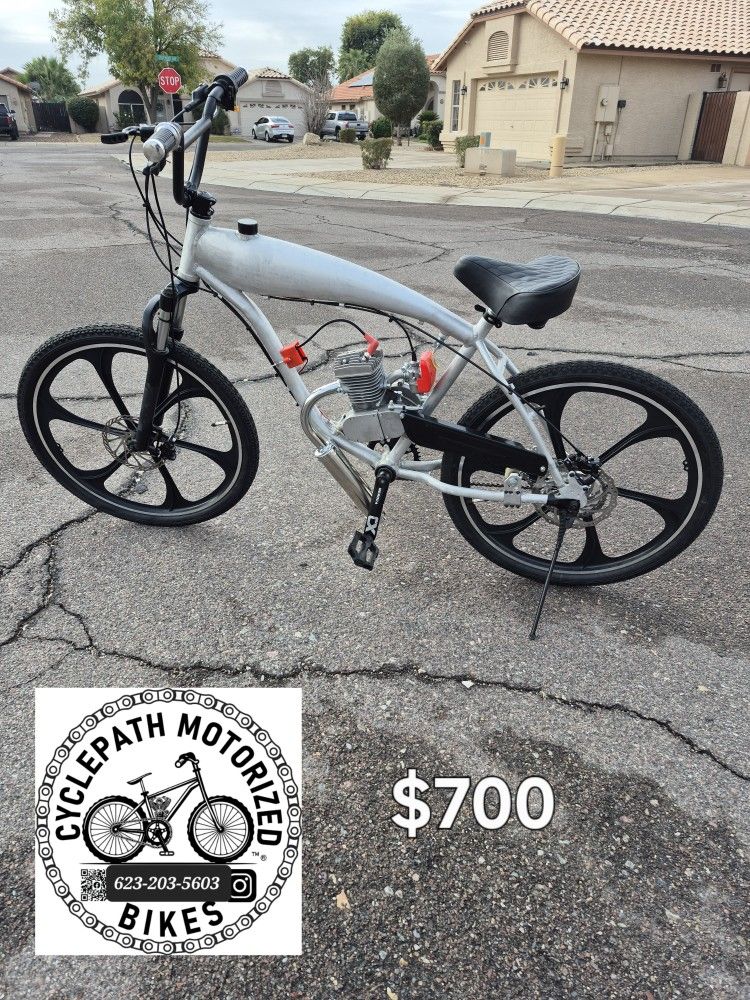 This bike is special it has an Avenger 85 on it very strong and powerful engineBefore you decide, I encourage you to view the other bikes for sale. Then come and see a Cyclepath bike – the difference in build quality, components and craftsmanship will be obvious. ALL CYCLEPATH BIKES ARE BRAND NEW BUILDS The many benefits of building motorized bikes using new equipment are safety related. All custom bikes are built and crafted by an experienced Arizona builder. We only use premium motors,( Zeda Firestorm ) and durable hardware/equipment designed for performance and safety at speeds over 25 to 35 miles per hour. Don’t ask me how fast it goes it depends on your height and weight sprocket size and alot of other things. My bikes are built using quiet (95db) 80cc 2 cycle motors. They require a mixing of 2 cycle oil (we recommend Lucas) sold at any Oreilys auto parts with regular gasoline. Customers report getting up to 100 miles from 1 gallon of mixed gas. That’s 2 full tanks. Depending on where you live, that is a cost of only around $2.50-$3.00 to fill up twice. What’s not to love about getting close to 50 miles from a single tank of gas? 49cc and less you are not required to have a motor vehicle license and do not have to register or title them with the state. I double dare you visualize or see the difference between a 49cc and 80cc. I personally test-ride each custom bike I build to ensure peak performance before you take your new bike home. This provides you with “peace of mind” knowing you’re riding a brand new bike that’s safety checked and ready to ride. Don’t forget, if exercise is what you’re after, just pedal. PLUS, and this is a big one. I provide you with on-call support during your bike’s break in period. This means you can contact me with any problems or questions, and I WILL, answer your call. A service you WILL NOT find anywhere else. My custom bikes are available for viewing daily. Just text or call (Phone # is in the photos) for a faster response. Delivery is available for a reasonable gas fee. If you are looking for a safe, reliable motorized bike with value you can appreciate, come see the difference firsthand. Serious inquiries only. Looking for hassle-free, drama-free sale. Built with pride and ready to ride. Ride a bike today. Contact now to schedule a time to view.