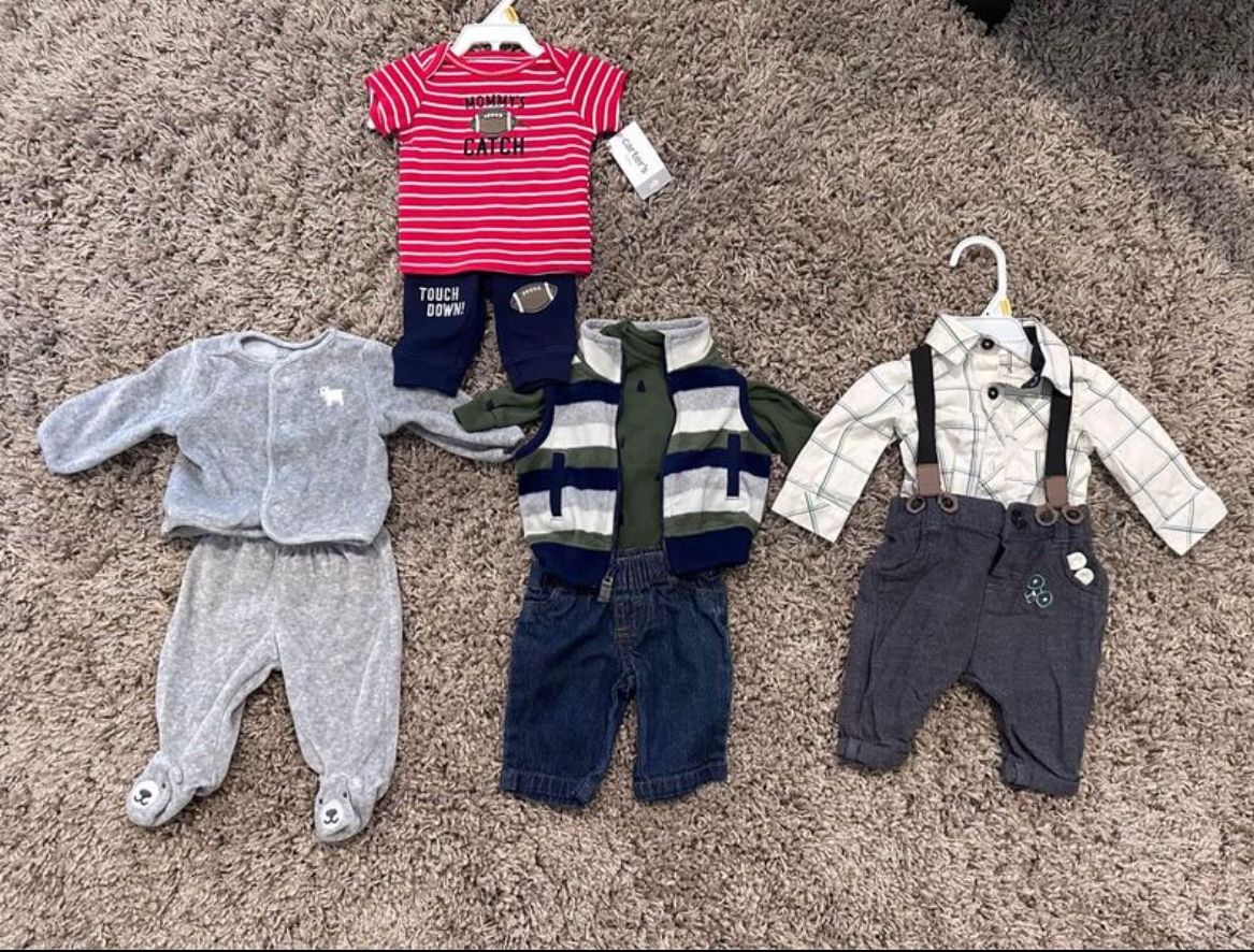 Some new with tag others worn once. $40 for all or prices as listed. Mommy’s Catch set new $10 Grey set $10 LS onesie/vest/jeans $13 Button up onesie/overalls set $15 Check my other listings for baby items
