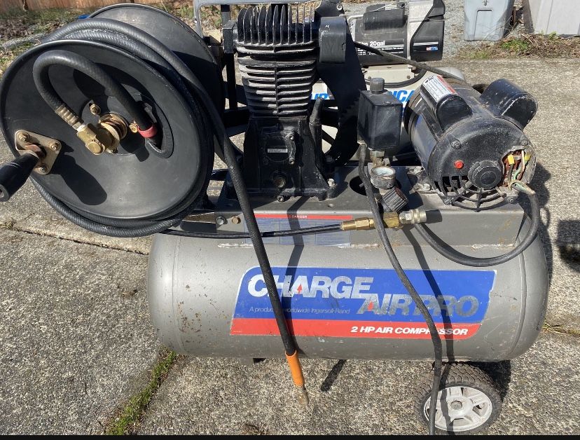 2 horsepower air compressor with hose reel. In good working condition