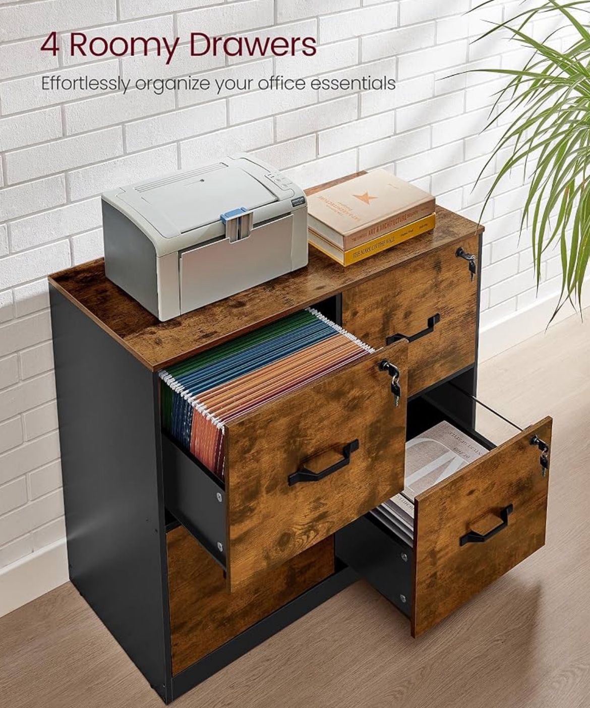 New in box 4 Drawer File Cabinet with Lock, Printer Stand, Office Filing Cabinet Organizer, for A4 and Letter Size Documents, Rustic Brown and Black UOFC062B01