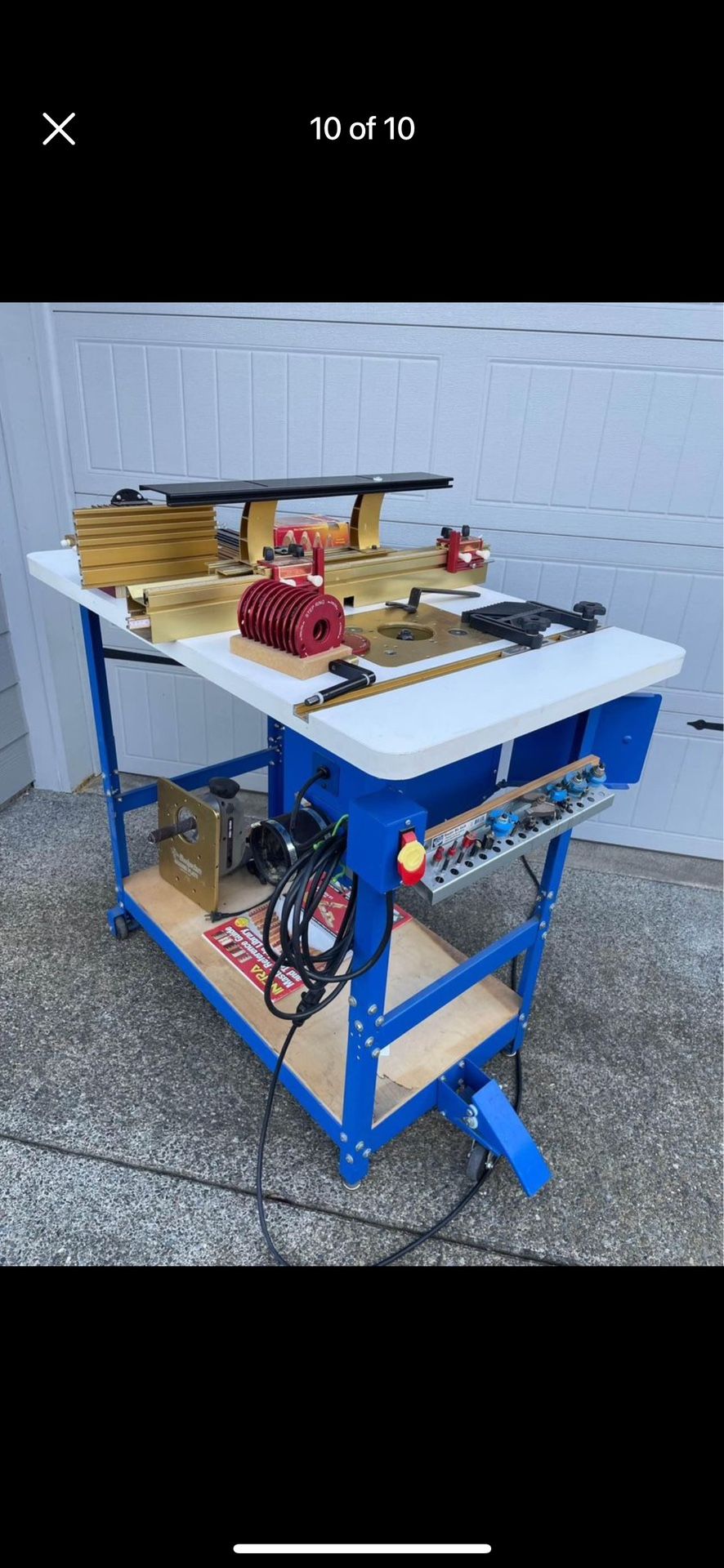 Incra Twin Linear Dual Carriage System – Delivers micrometer-level accuracy for routing operations with full repeatability. Perfect for dovetails, finger joints, and box joints. • Dual Split Fence – Independently adjustable fences for zero-clearance cuts and optimal dust collection. • Router Table Top – Sturdy phenolic/resin-coated MDF with built-in miter and T-track slots. • Heavy-Duty Steel Stand – Rock-solid mobile base with locking casters for easy repositioning in your shop. • Router Lift + Motor – (Specify make/model here if included — e.g., Porter-Cable 7518 or JessEm Mast-R-Lift) • Magnetic Safety Power Switch – Easy-access emergency shutoff. • Router Bit Storage Rack – Clean and organized, keeps your bits accessible and protected. • Accessories Included: • Featherboards • Hold-down clamps • Positioning stop blocks • Push sticks • Setup bars