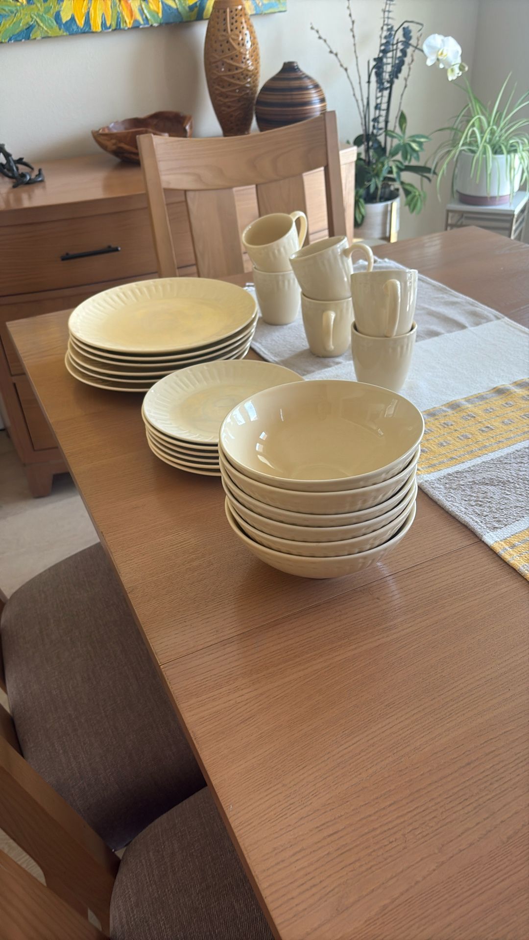 6 Dinner plates 6 Salad plates 6 Bowles 6 Mugs No chips - good condition Dishwasher and microwave safe!