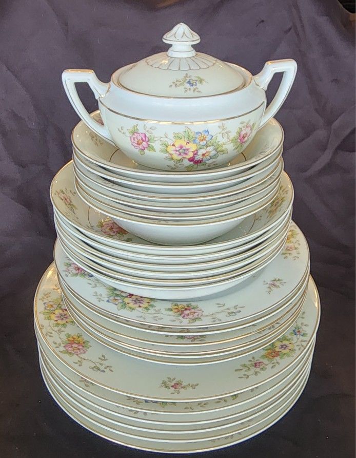 12 Dinner Plates 10 inch 12 Salad Plates 8 1/2 inch 10 Fruit/Desert Bowls 7 1/2 inch 11 Soup Bowls 6 inch 1 Teapot 5 inch tall