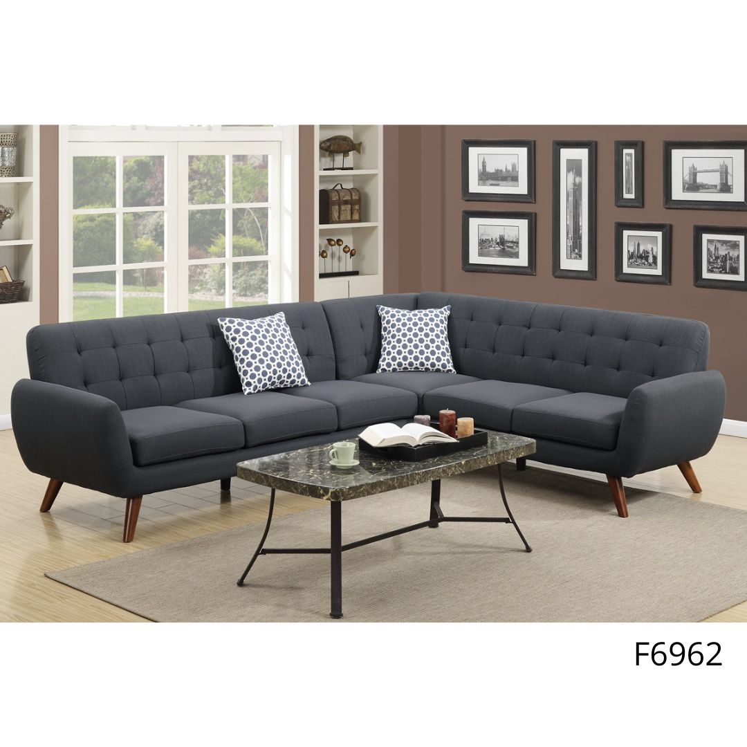 Sectional Sofa Item # F6962 Color: Ash Black Features: Accent Tufted Back Support Peg Leg Supports Available in Grey, Ash black & Laguna Also Available in Espresso Bonded Leather Some Assembly Required Materials: Polyfiber Pine Wood Wooden leg Dimensions: 111″ x 85″ *Chaise is Not Reversible