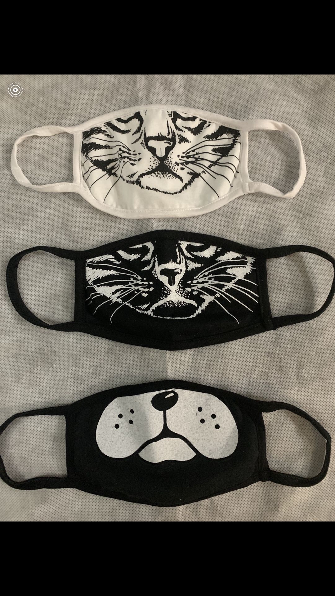 100% Cotton Lightweight, double layered Soft Cotton Ear-loops fit all Durable and breathable. Washable and reusable Great for kids and adults! They come in a pack of three two cats and one dog! If you would like a different mix just let me know!